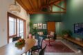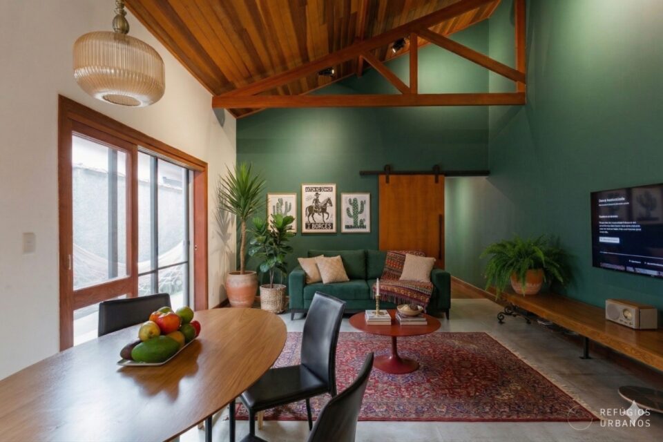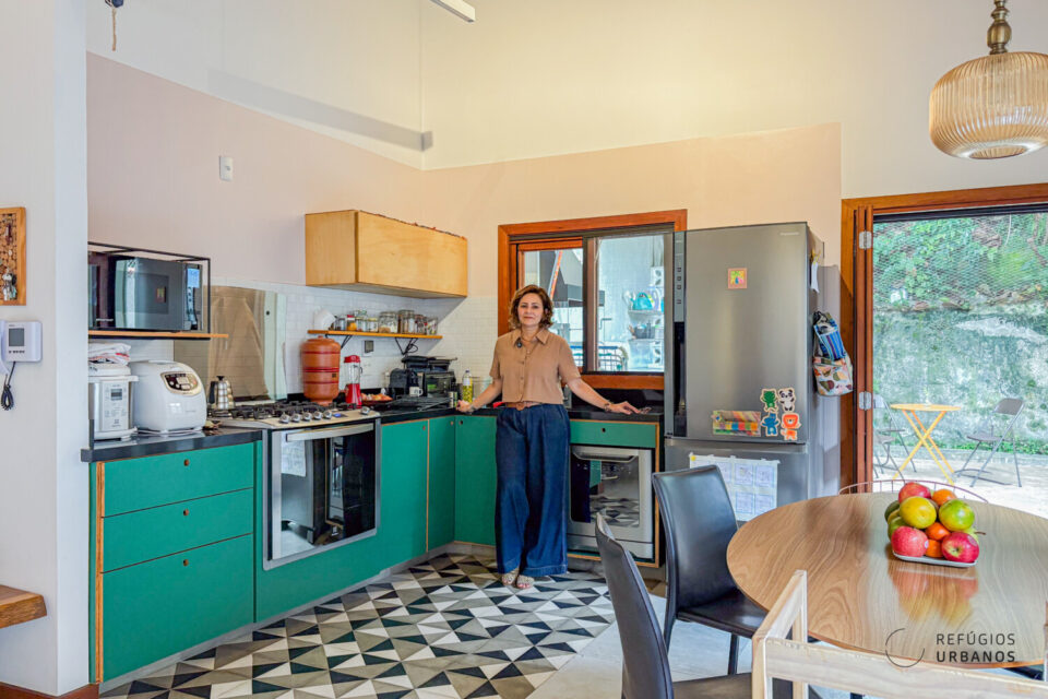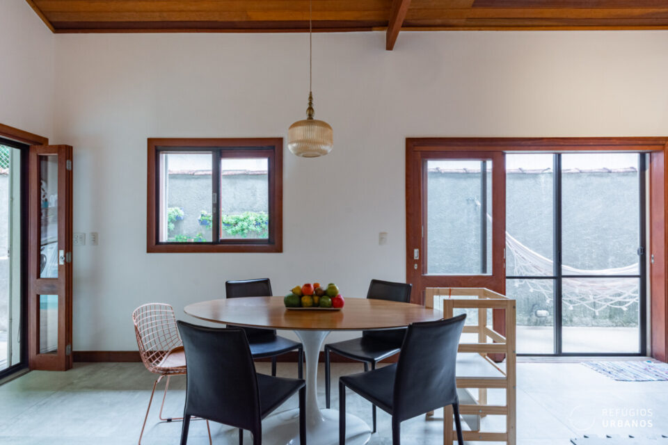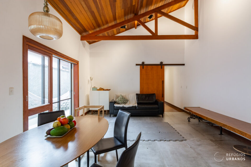 Então chegamos ao ambiente que definitivamente define este sobrado. Em 2014, a reforma abriu tudo, e a ideia era liberdade total. A cozinha e a sala de estar se integram num único espaço generoso, com amplas janelas que se abrem tanto para o corredor lateral quanto para o quintal. As vigas de madeira aparentes no teto dão charme e personalidade ao ambiente, sem esforço. Você pode montar uma sala de jantar aqui, um espaço de estar acolhedor, ou ainda os dois juntos, harmoniosamente.