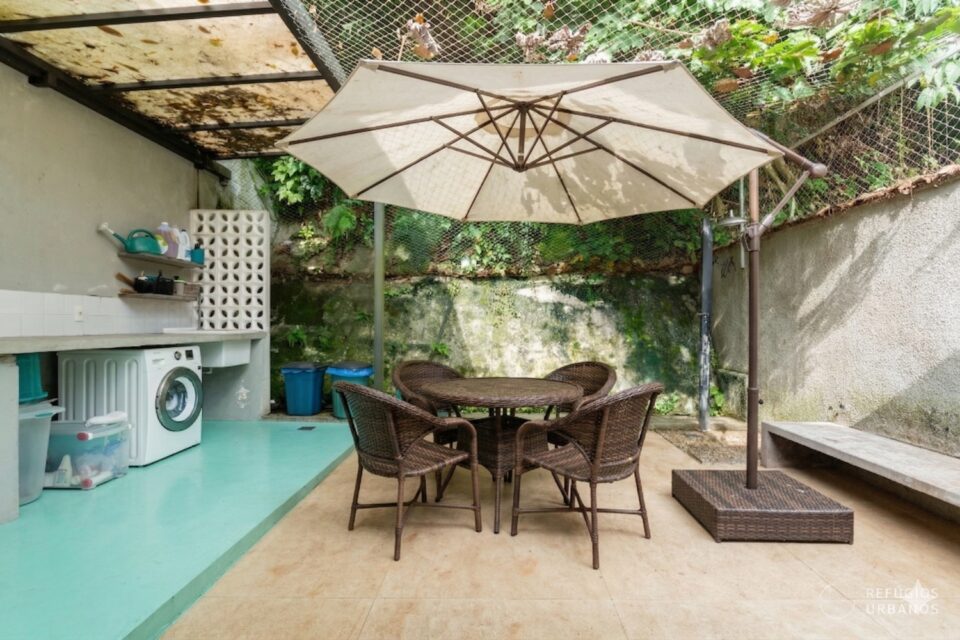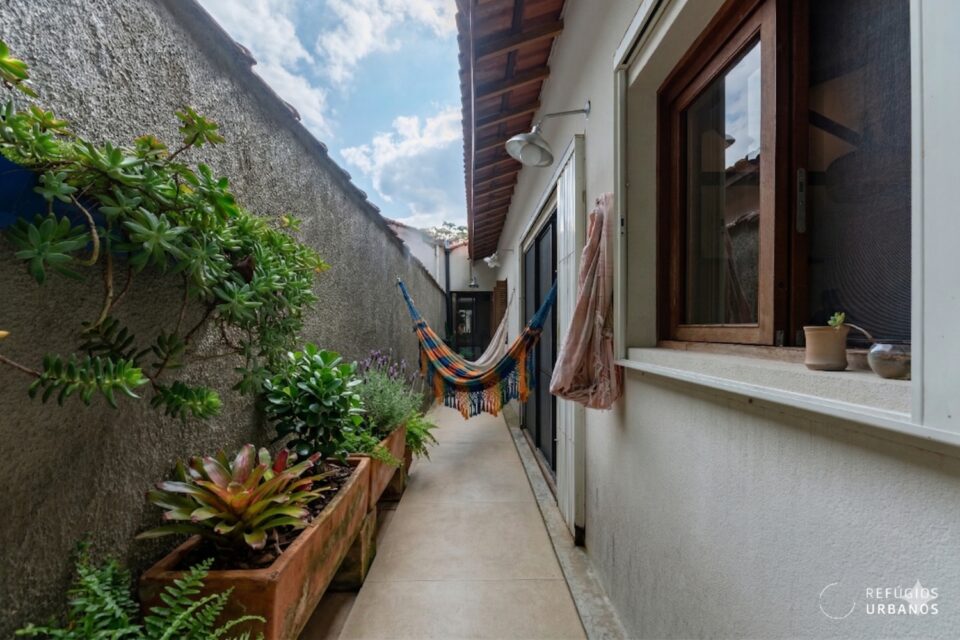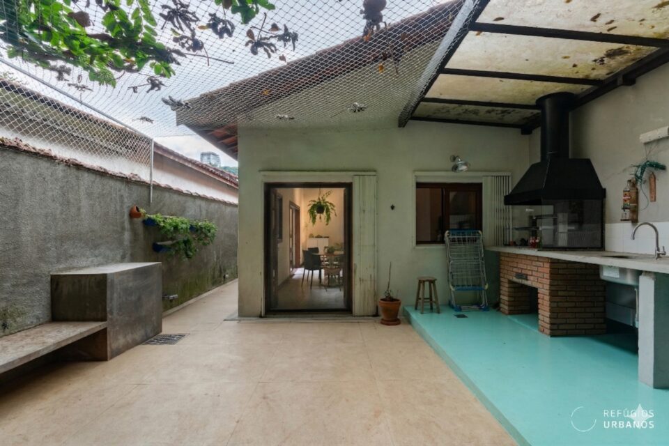 O espaço foi telado por um bom motivo: o muro de arrimo dos fundos dá para o quintal de uma casa com árvores frutíferas — inclusive um abacateiro, e a tela evita que os frutos caiam no chão ou sobre alguém. É um detalhe pequeno que diz muito sobre o cuidado de quem mora aqui.