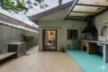 Do living, você segue para o quintal, e já sente o sol da tarde chegando. A churrasqueira está pronta para receber. A lavanderia também fica aqui, discreta e funcional.