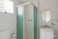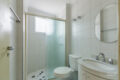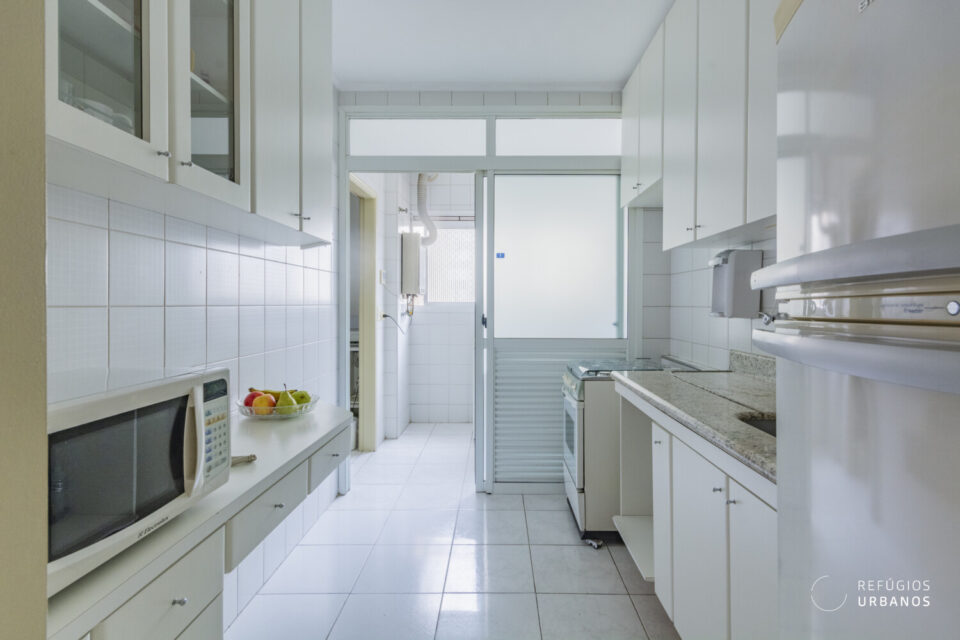 Enquanto isso, a cozinha foi otimizada para o dia a dia, com ótimo aproveitamento de bancada e circulação fluida. Logo ao lado, a área de serviço mantém o mesmo padrão de organização e ainda conta com um banheiro de apoio, perfeito para o cotidiano.