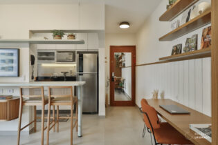 Cozinha parcialmente integrada, com projeto bacana e funcional.
