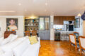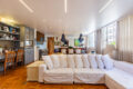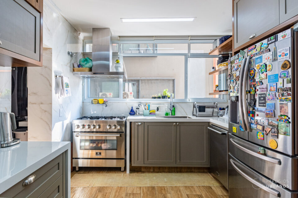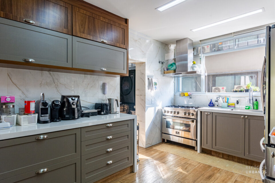 Inicialmente, o projeto de reforma é uma ode à elegância discreta. A integração entre sala e cozinha é impecável, preservando a sensação de amplitude e o prazer de receber.