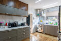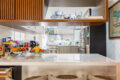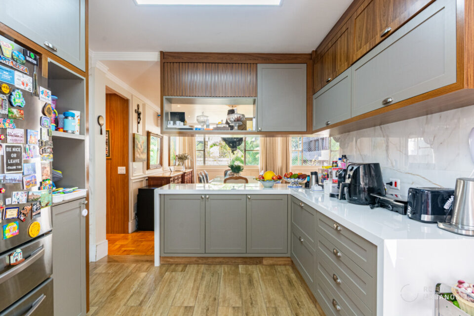 A cozinha conta com uma bancada convida à convivência, tornando-se um ambiente que proporciona num toque especial ao cotidiano.