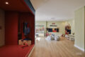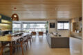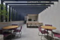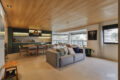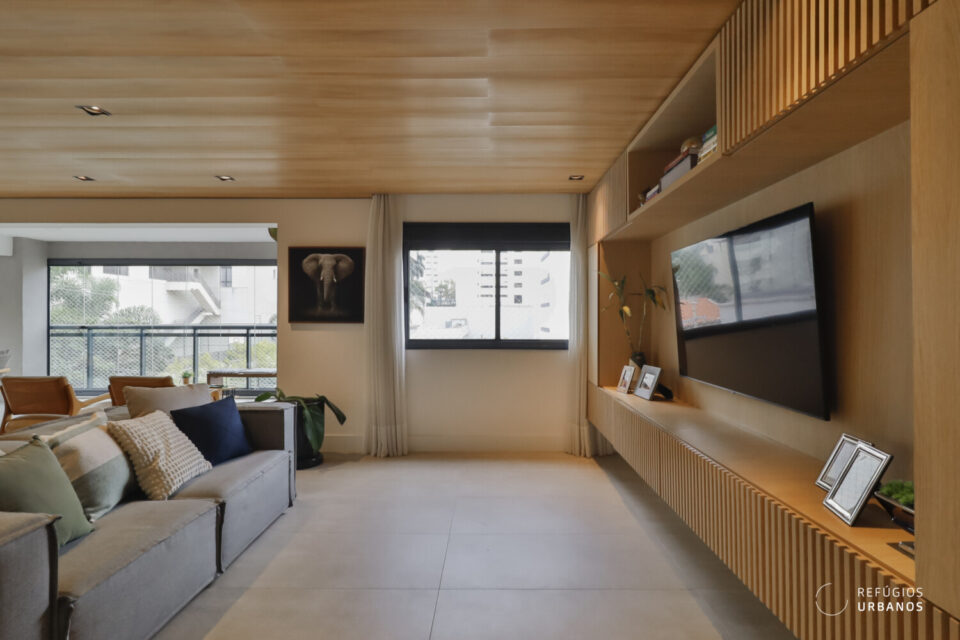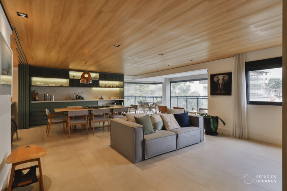 No teto, o forro em madeira reforça a sensação de acolhimento, criando um ambiente que convida a ficar.
