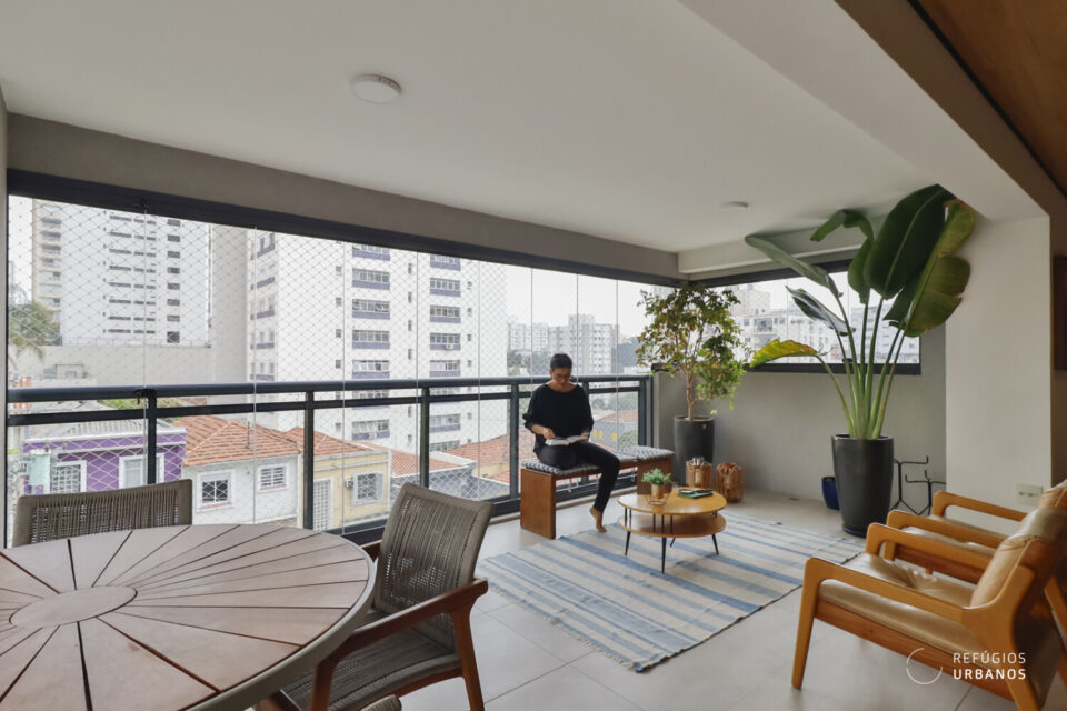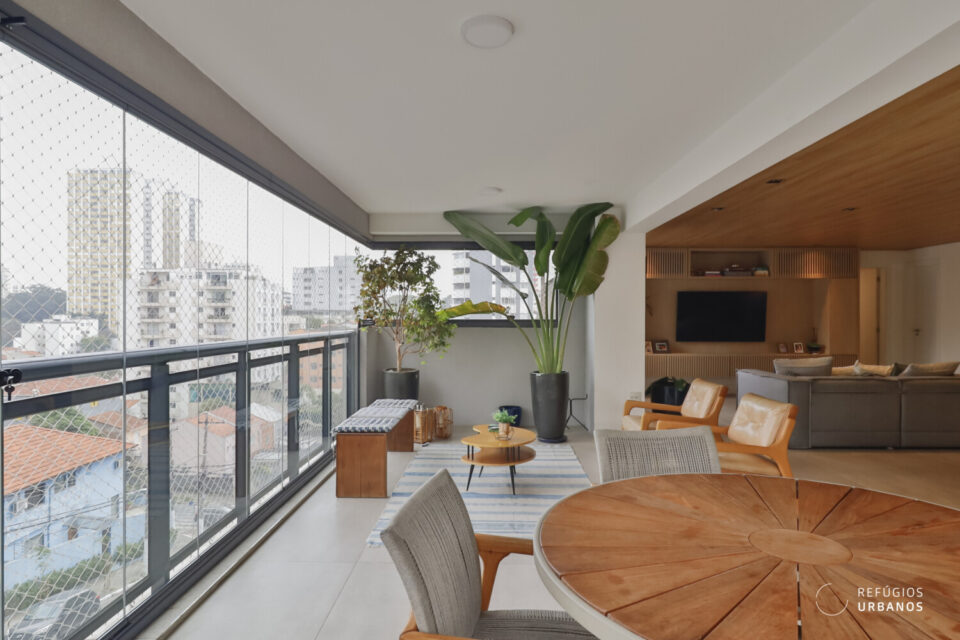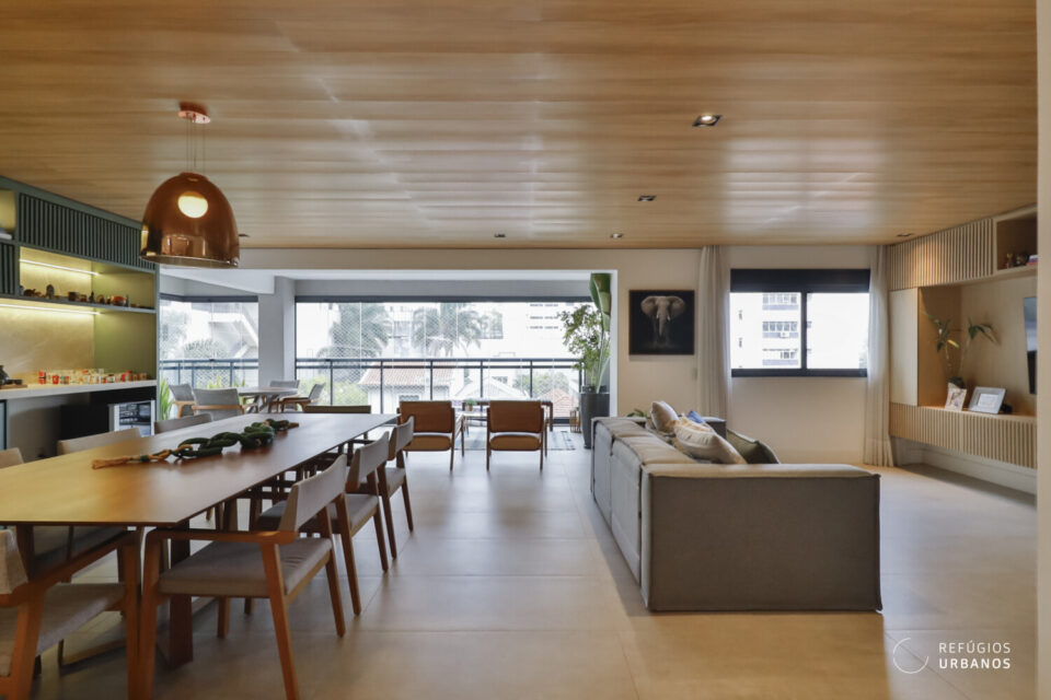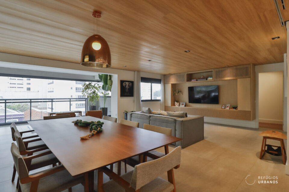 O olhar é imediatamente conduzido para o varandão ao fundo, que se conecta de forma natural à sala. Esse espaço comporta, com muito conforto, quatro ambientes bem definidos: a sala de TV e estar, a sala de jantar com mesa para oito pessoas, um segundo espaço de estar junto à varanda e, por fim, uma mesa menor que pode receber refeições mais práticas.