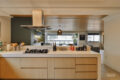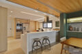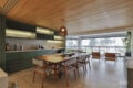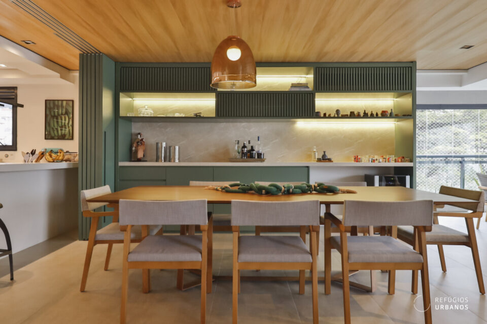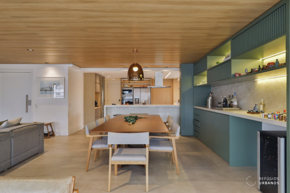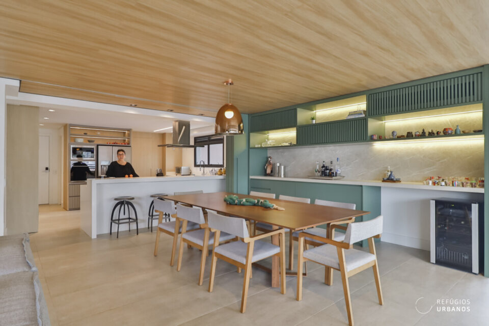 Ao seguir para a cozinha, encontramos um verdadeiro espetáculo. Portas de correr em marcenaria verde permitem separar os dois ambientes quando necessário; no entanto, ao abri-las, a integração se torna total.