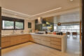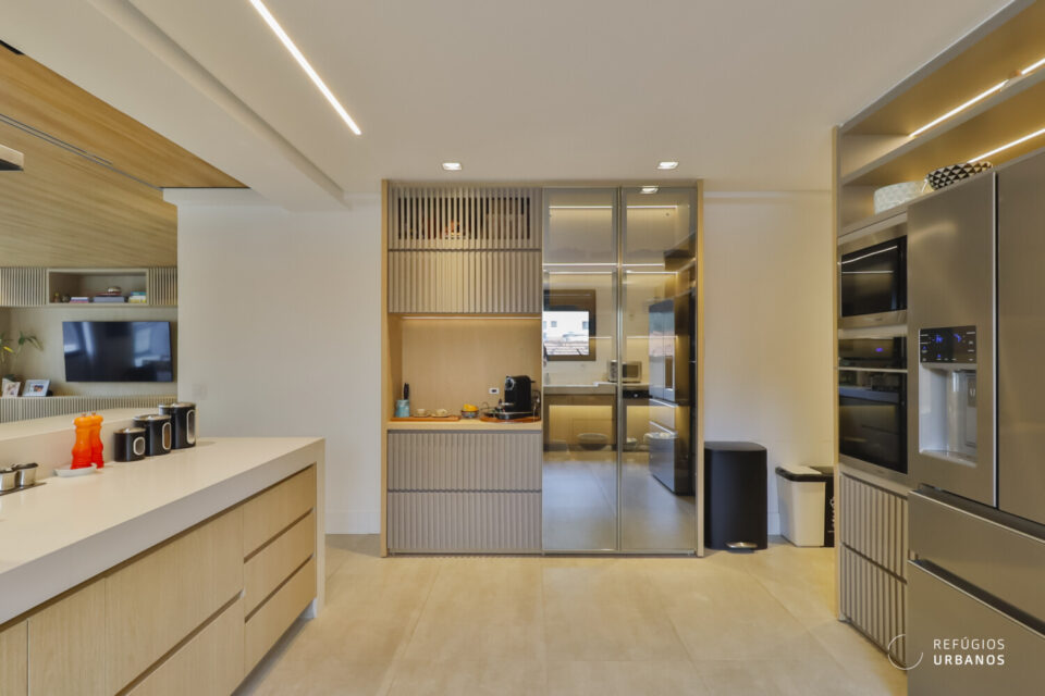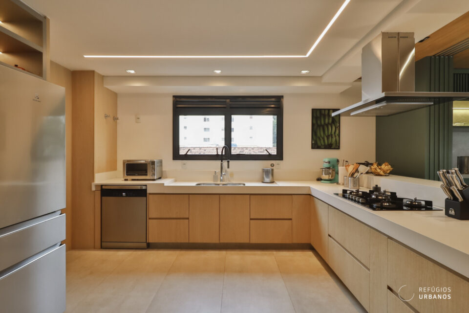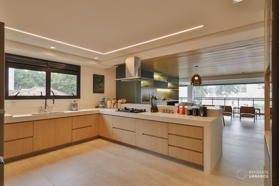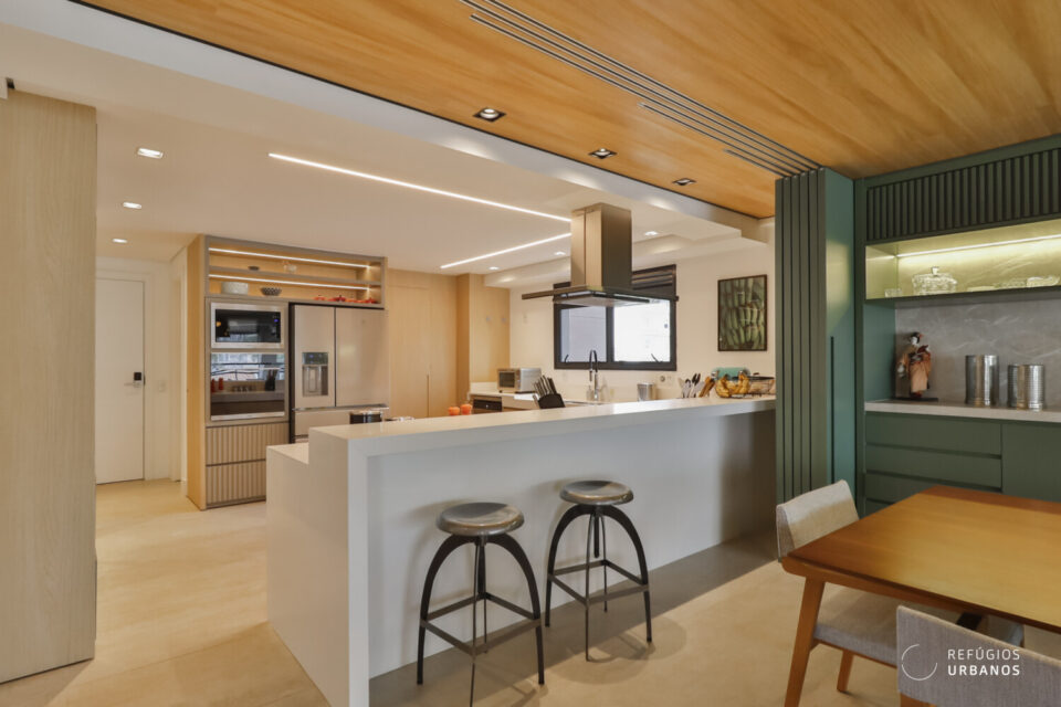 Um balcão mais alto, perfeito para banquinhos, convida a acompanhar quem prepara as refeições. Já a bancada em “L” garante uma área generosa de trabalho, enquanto a marcenaria de alta qualidade oferece espaço para organizar absolutamente tudo.