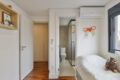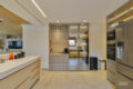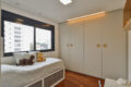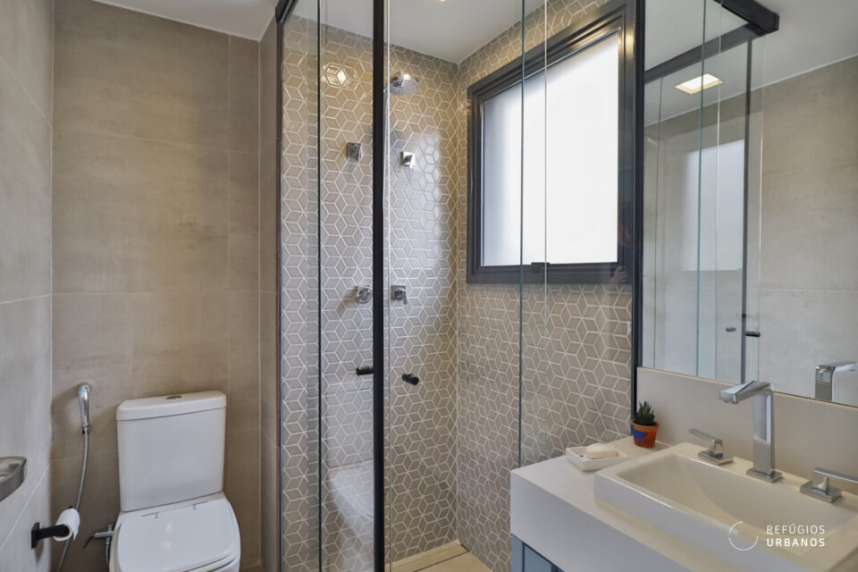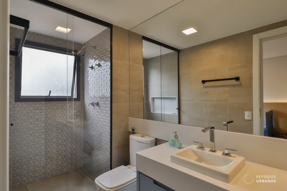 Ainda nesse espaço, um painel de madeira esconde discretamente a porta que leva à área de serviços, equipada com armários e excelente ventilação. Logo ao lado, um banheiro completo dá apoio ao dia a dia, tornando o ambiente ainda mais funcional.