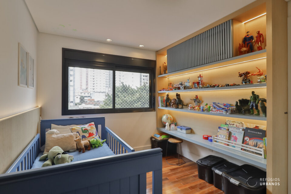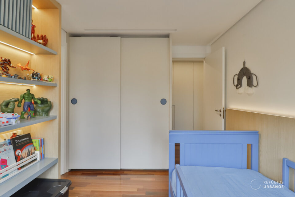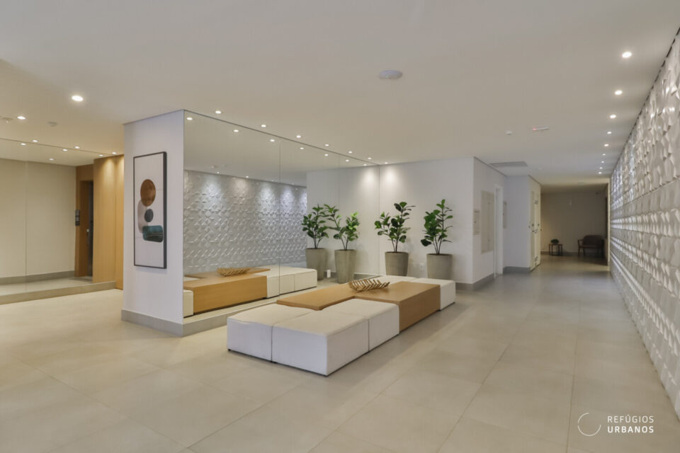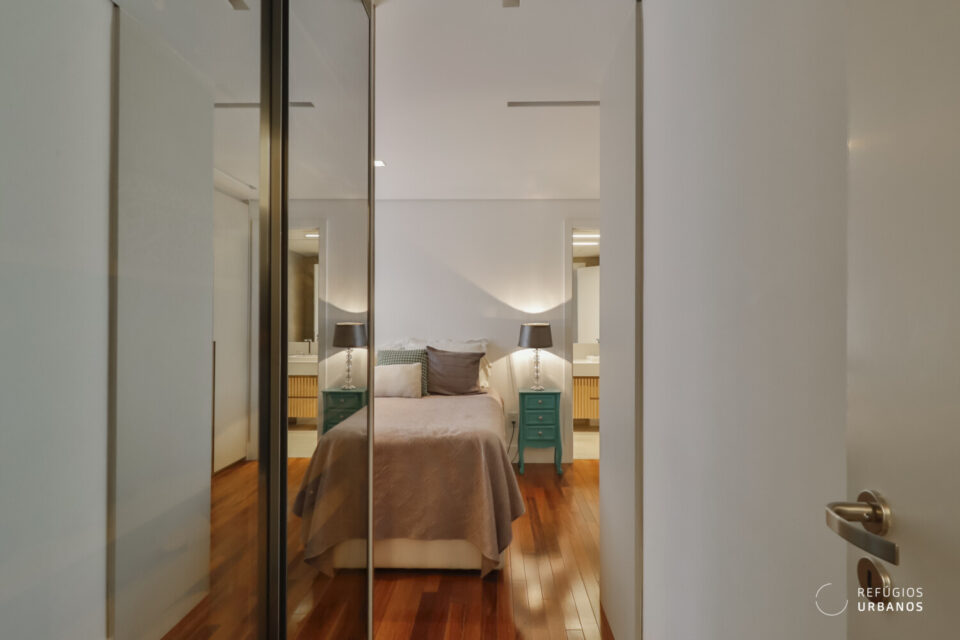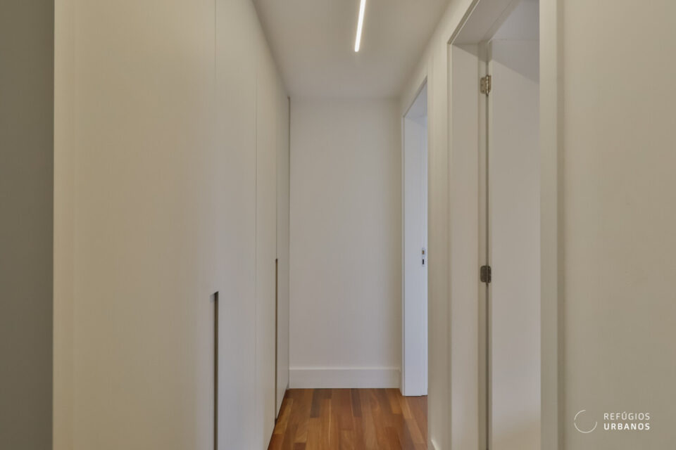 Já vimos que a sala é ampla, perfeita para reunir família e amigos. Agora, ao atravessar uma porta, chegamos à área íntima do apartamento. Nesse ponto, um hall com armários de rouparia distribui o acesso às três suítes.