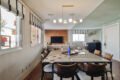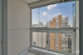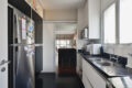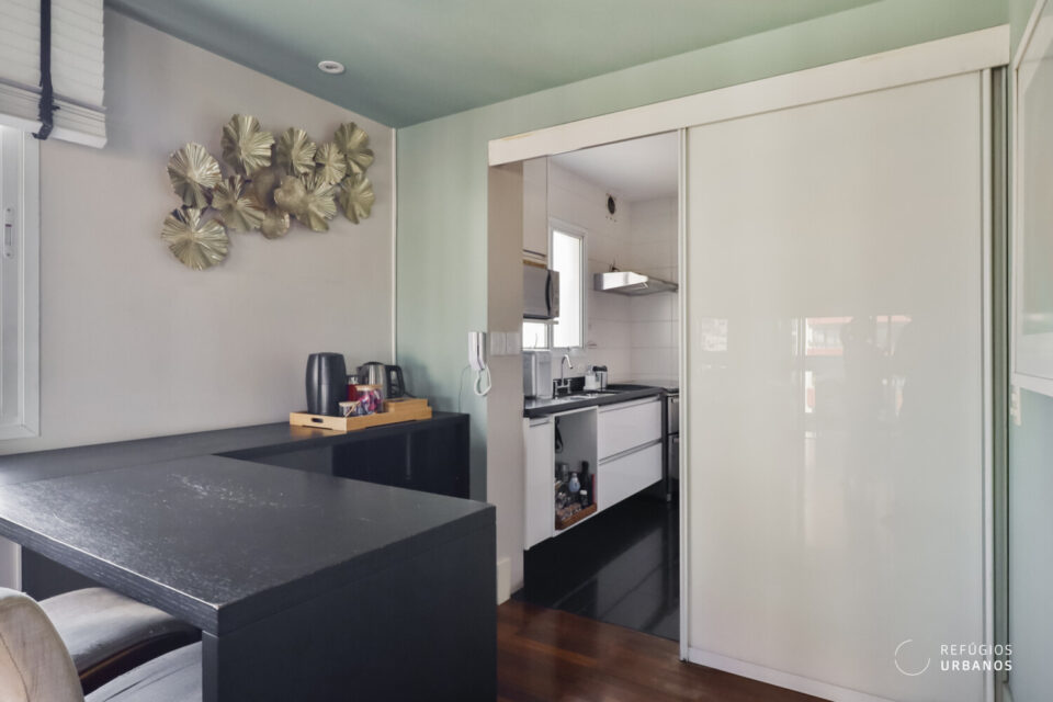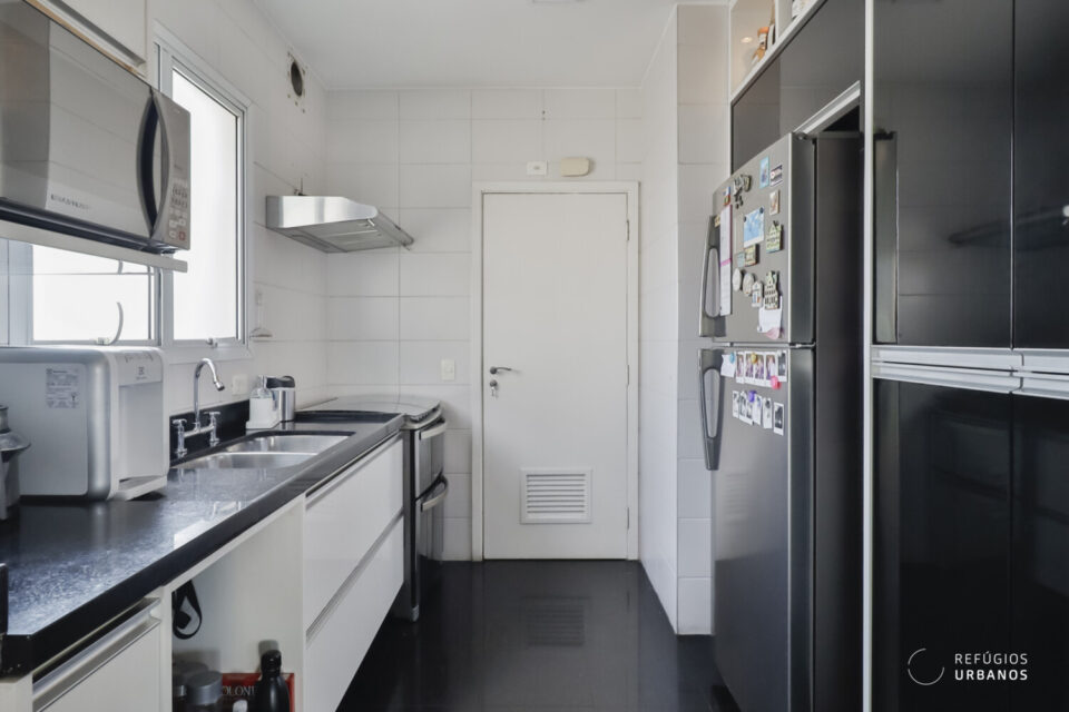 A cozinha está integrada à sala por uma porta ampla de correr, e possui bastantes armários. As grandes janelas trazem muita iluminação e ventilação.