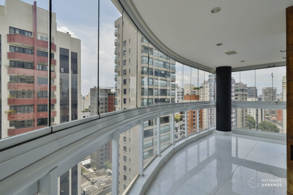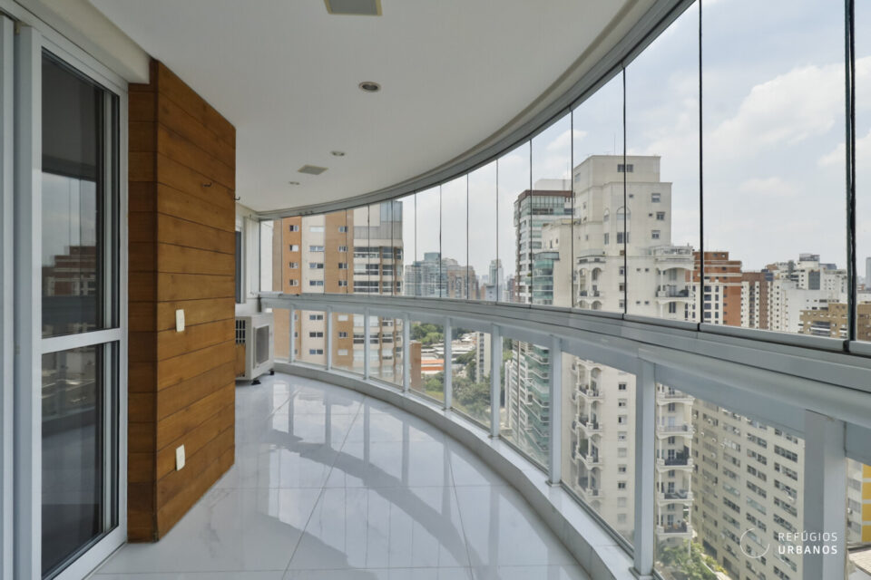 A varanda é ampla e ensolarada, já fechada por vidros.