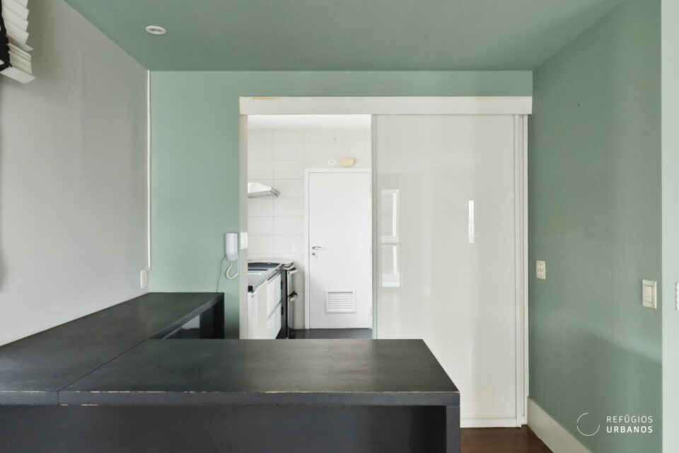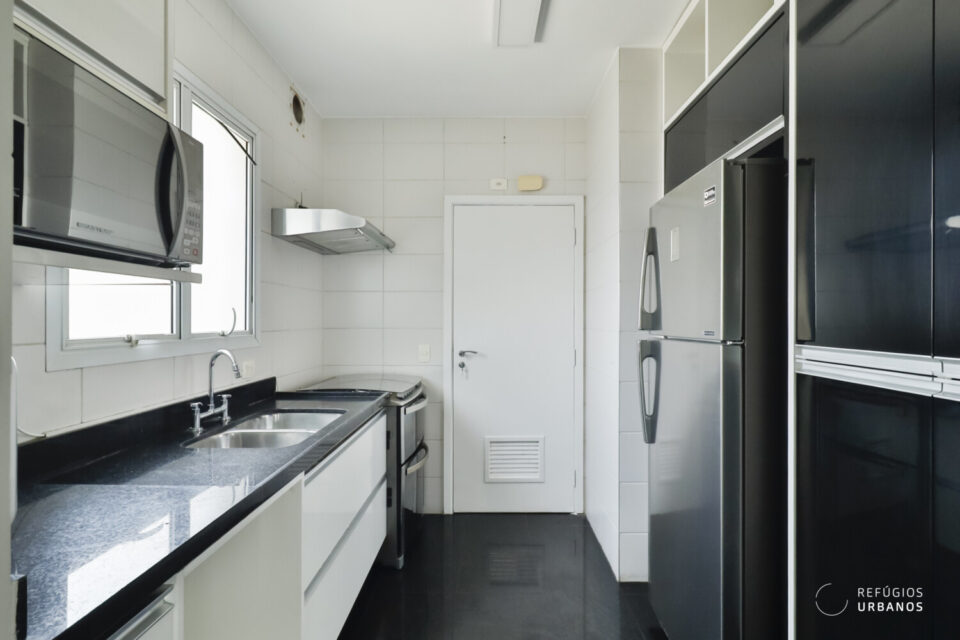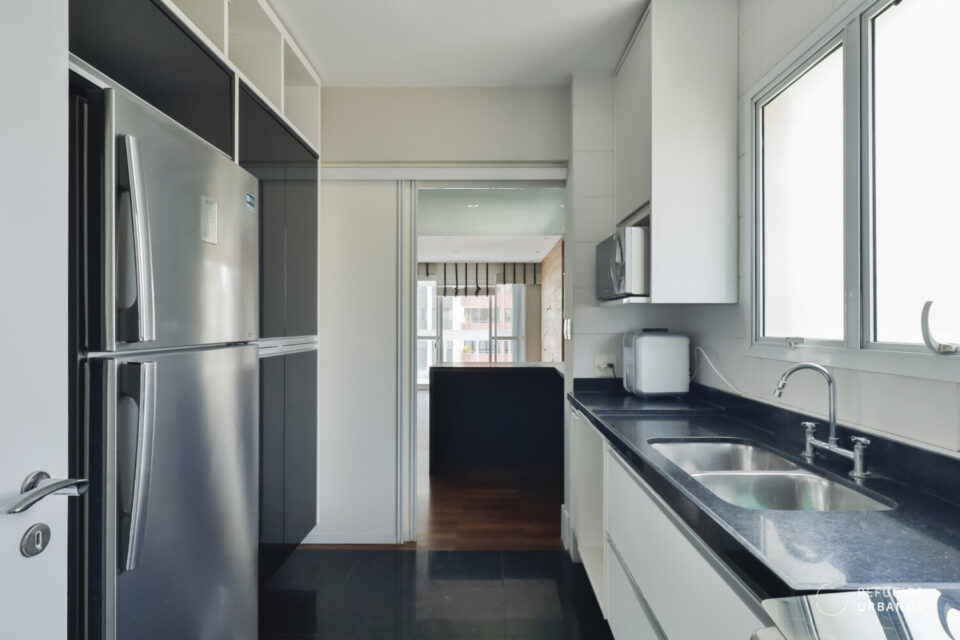 A cozinha está integrada à sala por uma porta ampla de correr, e possui bastantes armários. As grandes janelas trazem muita iluminação e ventilação.