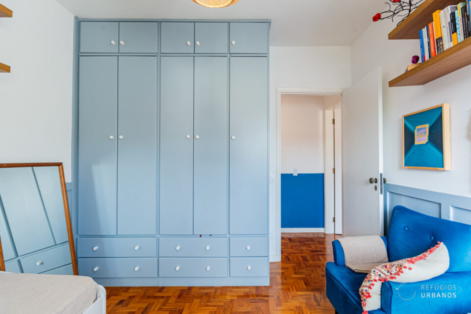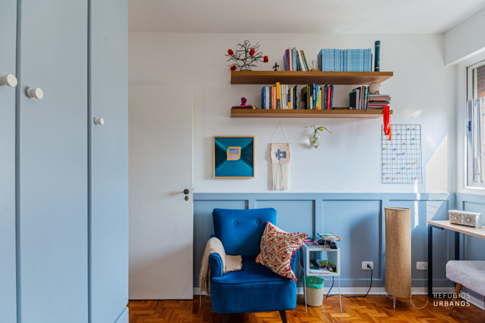 À direita, fica o quarto de visita, e ele funciona muito bem como escritório. Inclusive, ele tem um belo lambri nas paredes, combinando com o armário, que os moradores conservaram durante a reforma e que continua em ótimo estado.