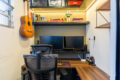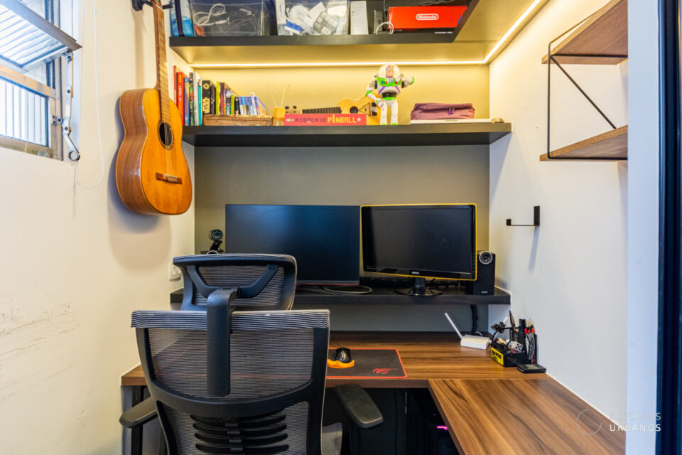 Logo adiante, a antiga despensa se transformou em um escritório funcional e bem reservado. Apesar do espaço compacto, ele é ventilado e agradável.