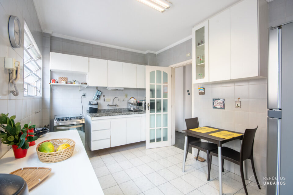 E já que falamos em família, a melhor descrição que encontrei para a cozinha desse apê foi: “é igual coração de mãe, cabe todo mundo e ainda sobra espaço!”.