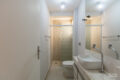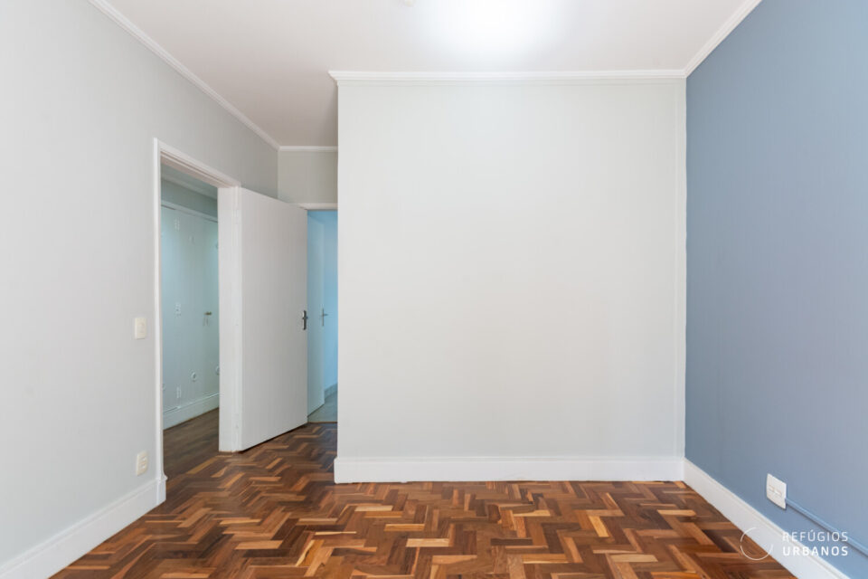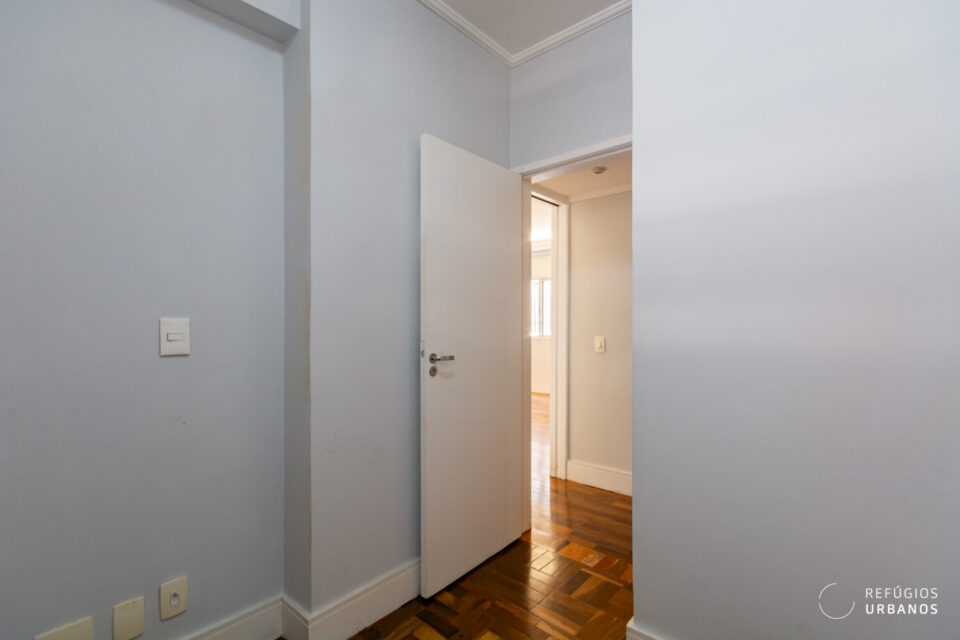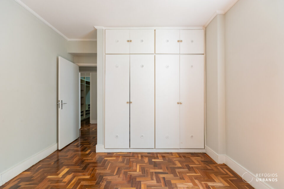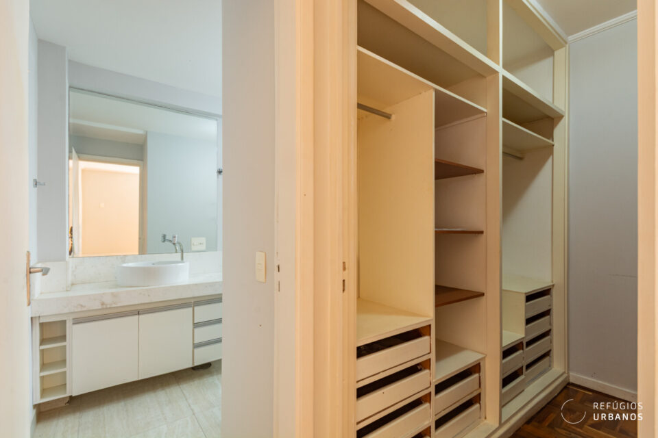 No corredor intimo, um roupeiro. Assim, temos mais apoio no dia a dia. Além disso, o antigo quarto de serviço foi incorporado a esse corredor. Hoje, integra a área íntima. Ou seja, surge um espaço extra e versátil. Para escritório. Ou apoio.