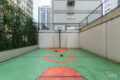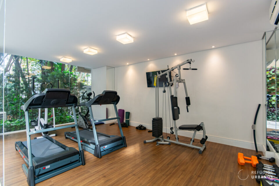 Há uma academia bacana. Além disso, quadra poliesportiva.
