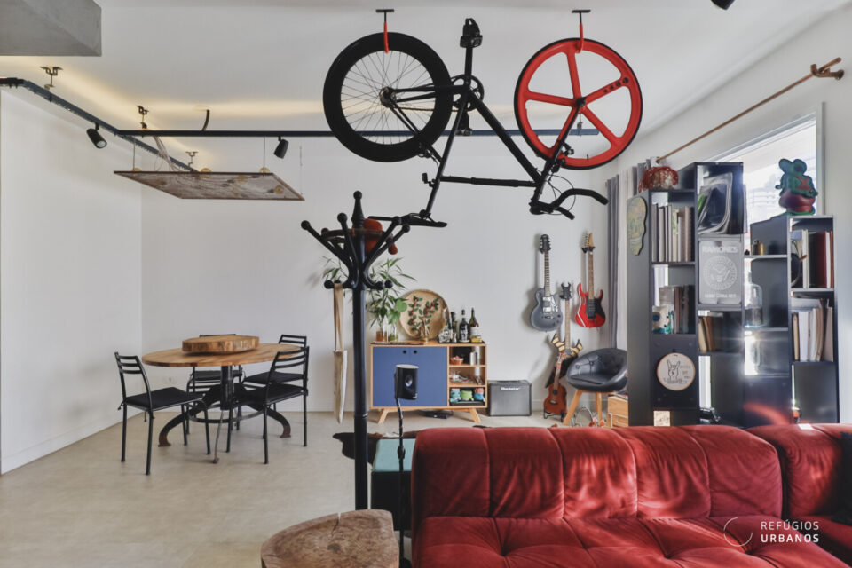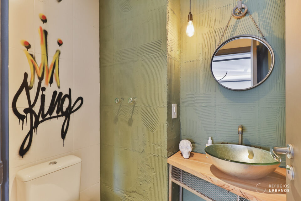 O lavabo, descolado e cheio de personalidade, é um charme extra para o apartamento.