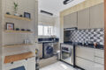 A cozinha, funcional e bem planejada, é integrada à área de serviço. Ela se destaca pela excelente iluminação/ ventilação natural e um projeto de marcenaria que alia design e praticidade.