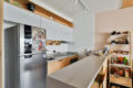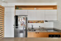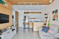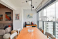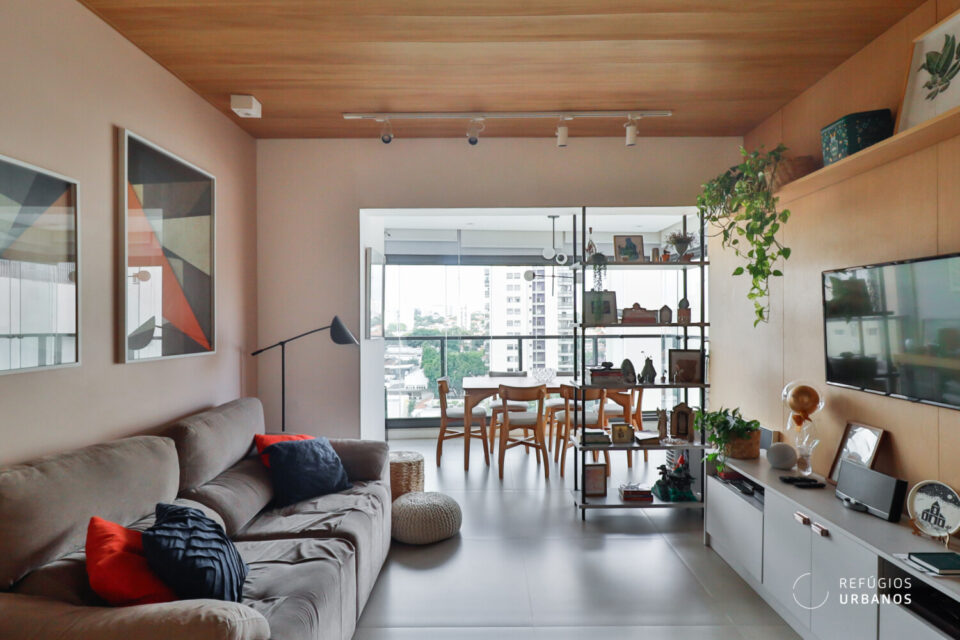 A sala se abre em um ambiente integrado e acolhedor, com forro de madeira natural que aquece visualmente o espaço, e trilhos de iluminação ajustável, garantindo assim versatilidade ao longo do dia.