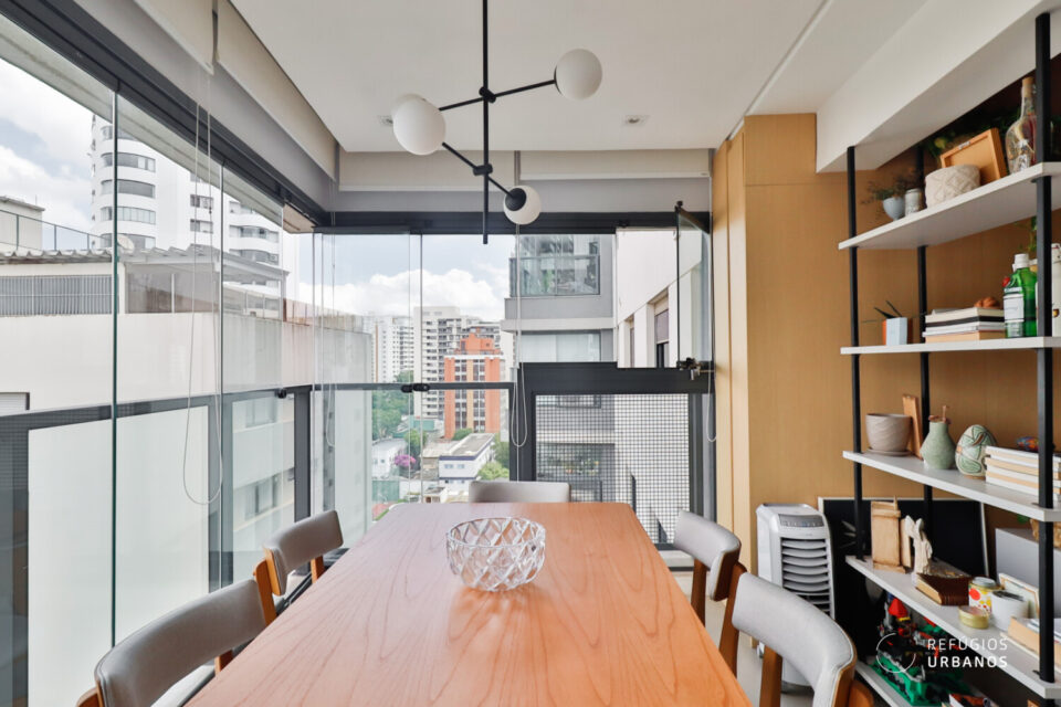 Luminosa e versátil, funciona como gourmet privativo com vista para a cidade.
