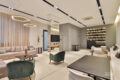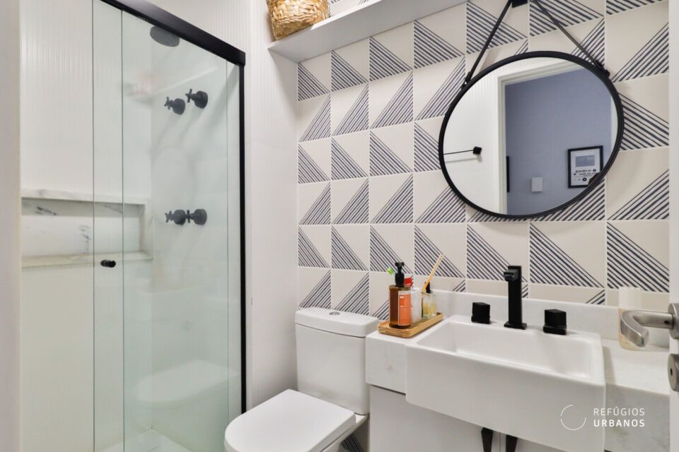 O banheiro da suíte, por sua vez, surpreende com revestimento 3D em branco, metais negros — detalhes que remetem a projetos assinados.