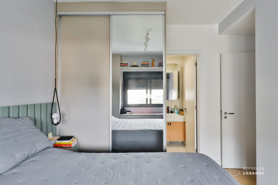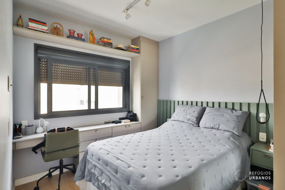 Já na área íntima, a suíte impressiona pela personalidade: cabeceira ripada em verde-sage, armários planejados integrados e iluminação de destaque, ou seja, um quarto que vai além do funcional.