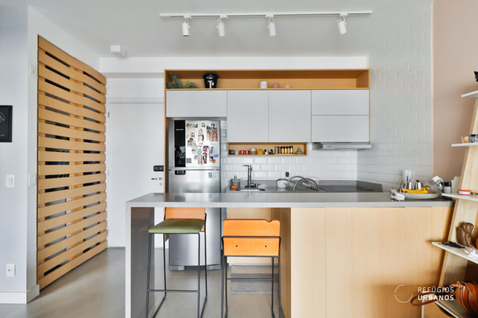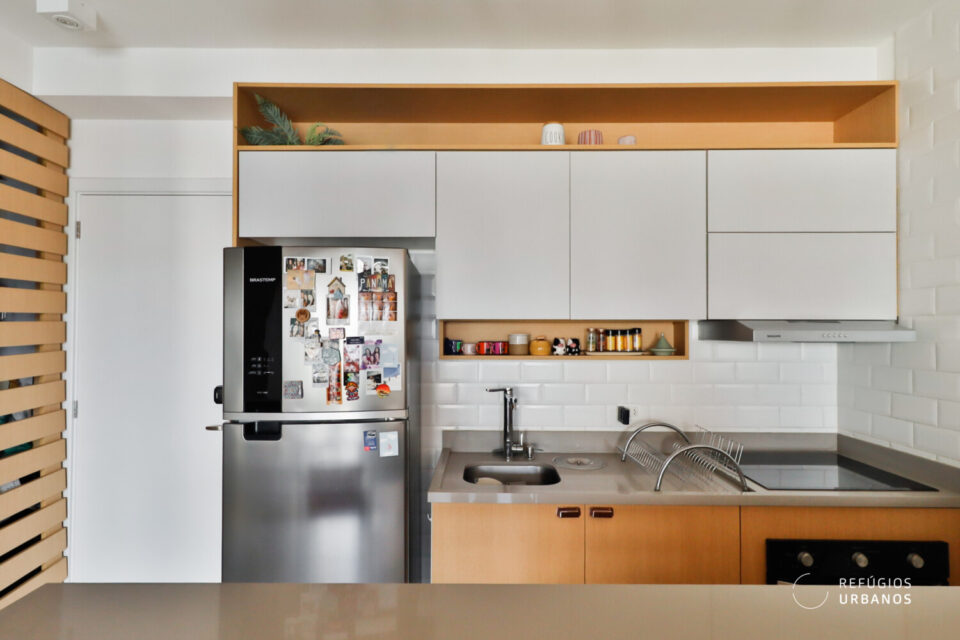 A cozinha ja esta integrada e bem equipada.