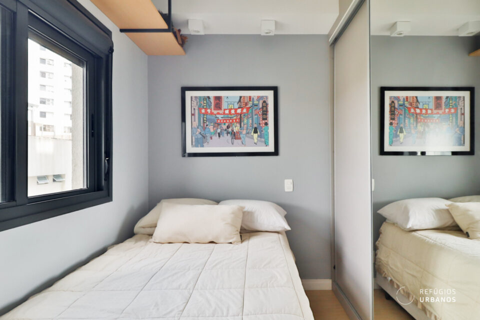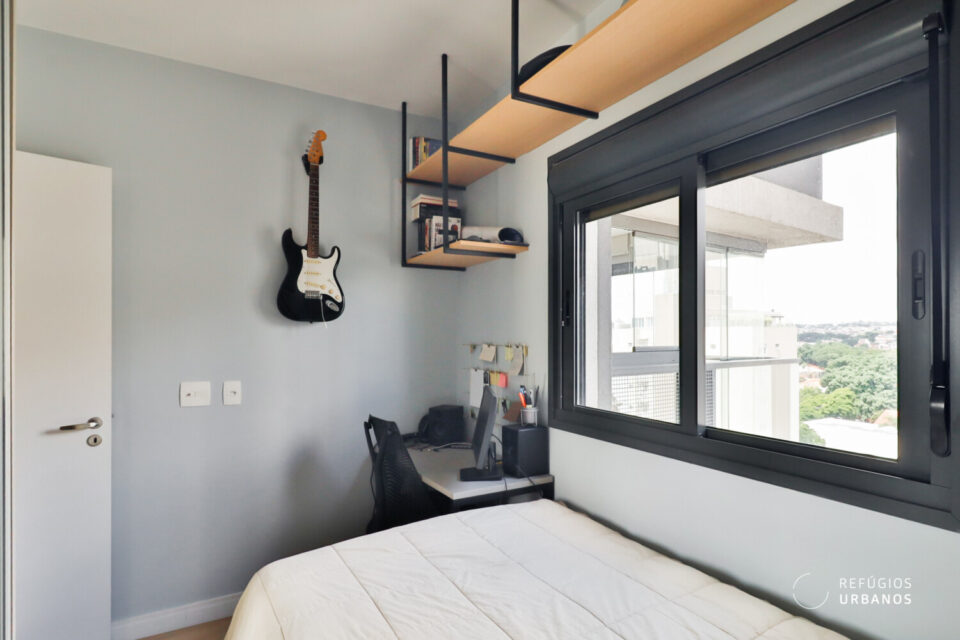 Por fim, o segundo dormitório se mostra amplo para o padrão do segmento, com prateleiras suspensas e espaço bem aproveitado — ideal como quarto de hóspedes, home office ou quarto de criança.