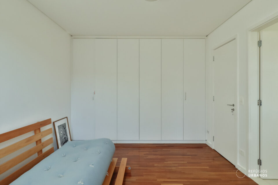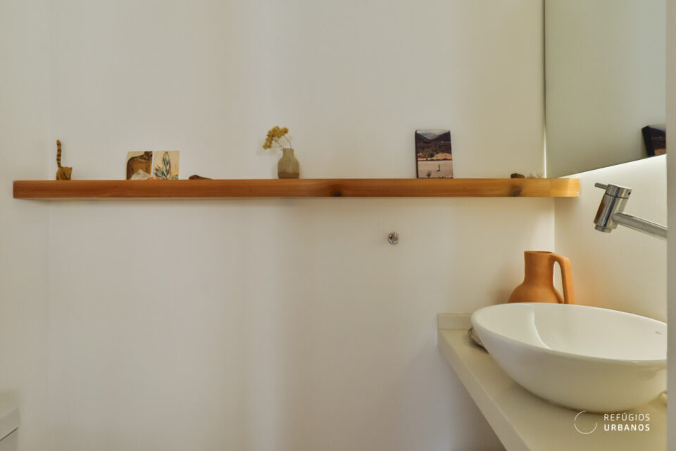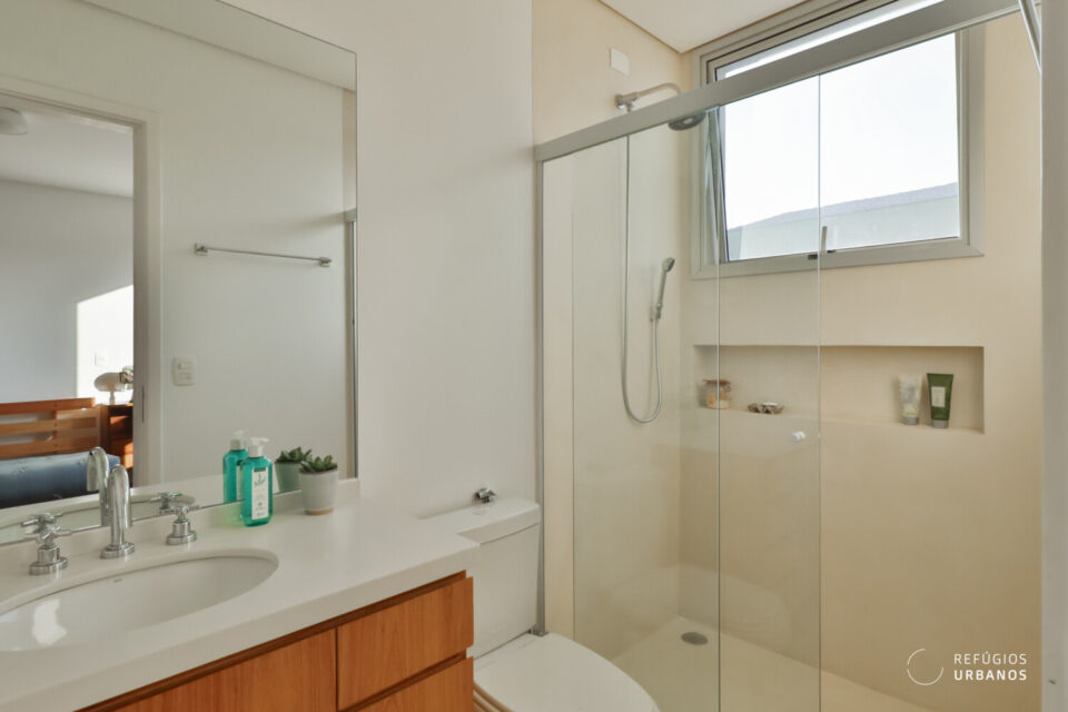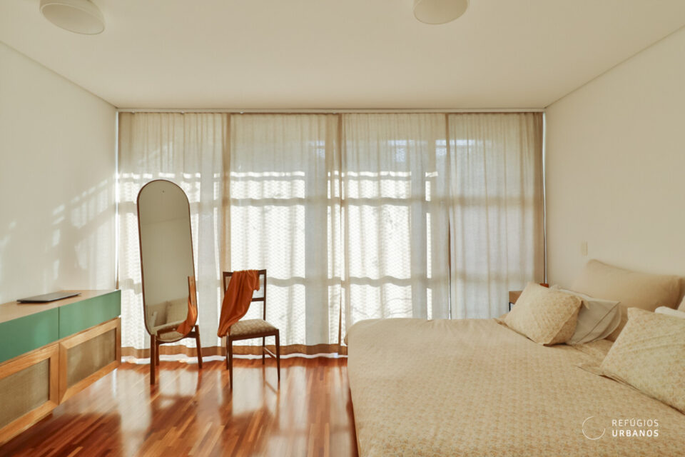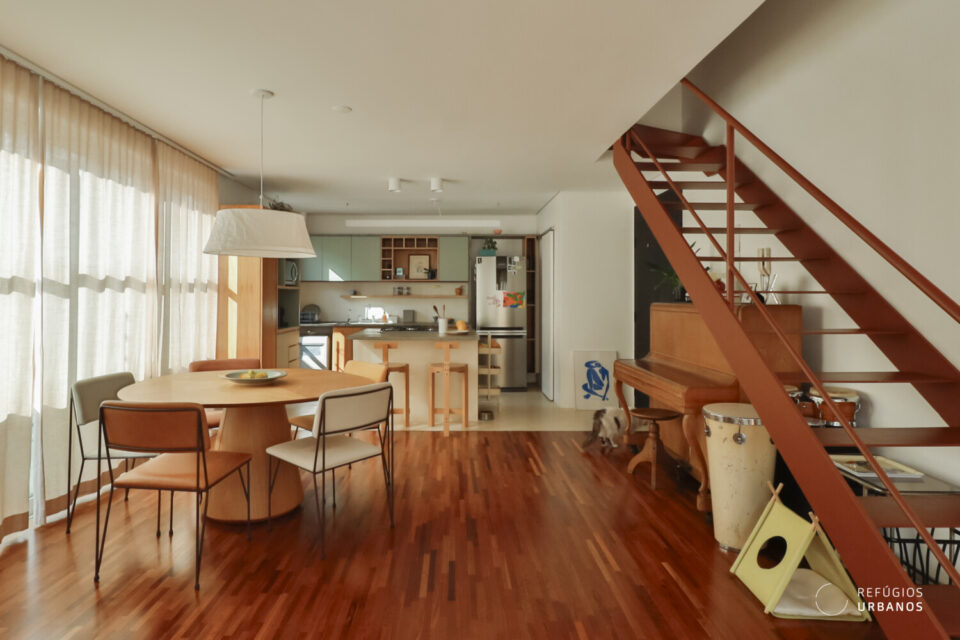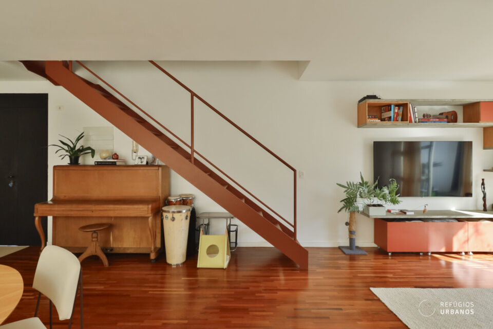 Por uma elegante escada, em uma das laterais da sala, chegamos ao pavimento superior, onde encontramos as duas suítes.