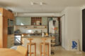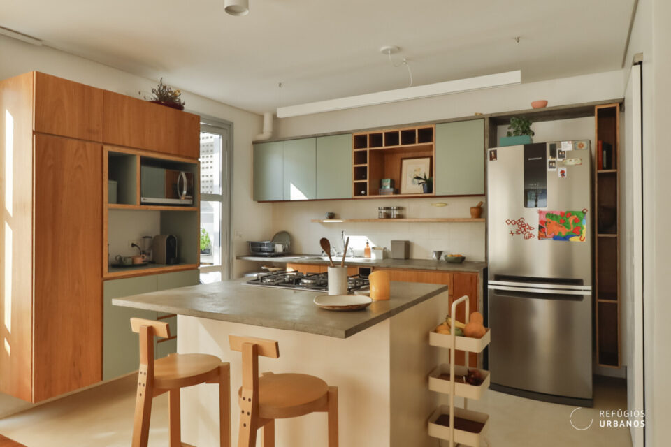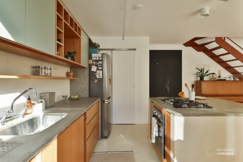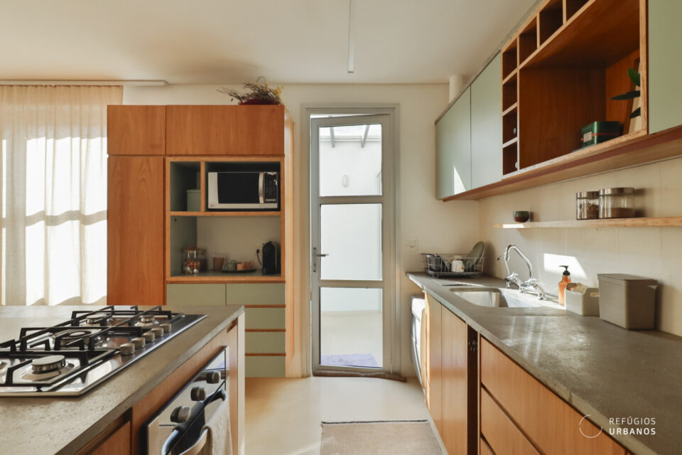 A cozinha, conta com marcenaria de excelente procedência. Ela é integrada à sala de forma harmoniosa e bem resolvida, formando, desse modo, um espaço amplo e funcional.