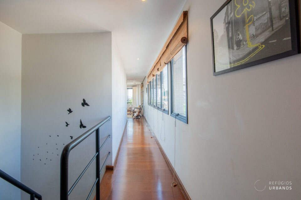 O trajeto é um charme à parte. Isto porque um corredor com janelas gostosas proporciona luz natural para o caminho, transformando então a circulação em um passeio agradável. A distribuição dos quartos é versátil: