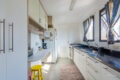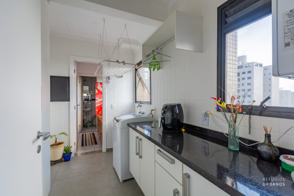 A cozinha por ser espaçosa e funcional, ela é daquelas projetadas para quem gosta de experimentar novas receitas. Na sequência, encontramos a área de serviço, que certamente não fica atrás no quesito espaço: a lavanderia é ampla e extremamente iluminada. Para completar, esta ala conta também com quarto e banheiro de serviço justamente ao final do corredor.