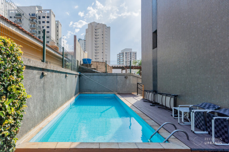 O acesso é facilitado por dois elevadores, social e serviço. Para os momentos de lazer, o condomínio dispõe de piscina, espaço para exercícios e um pequeno salão de festas.