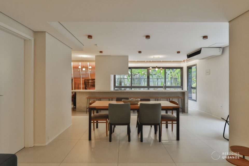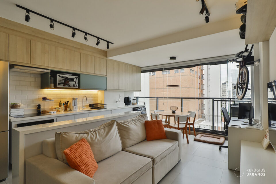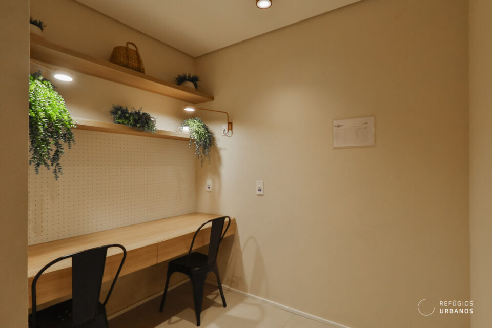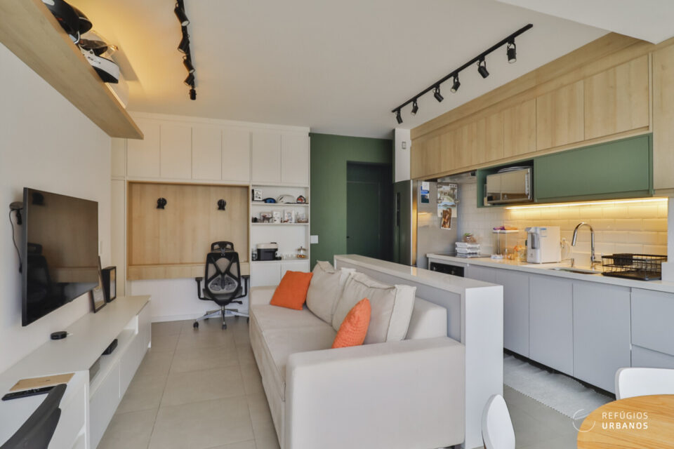 A varanda foi integrada à sala e cozinha. Possui um espaço de home office planejado para duas pessoas.