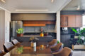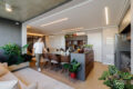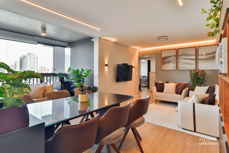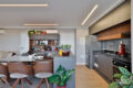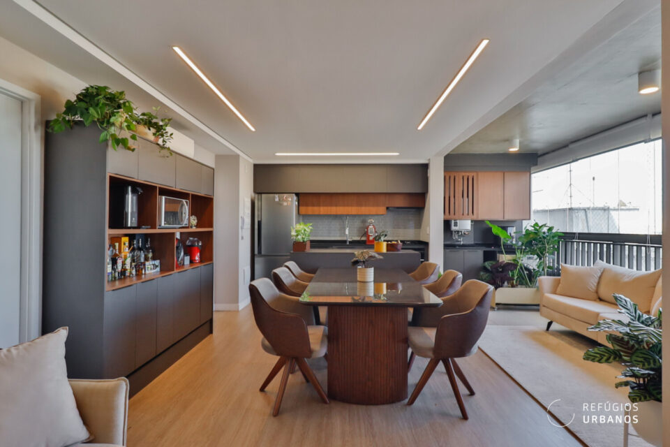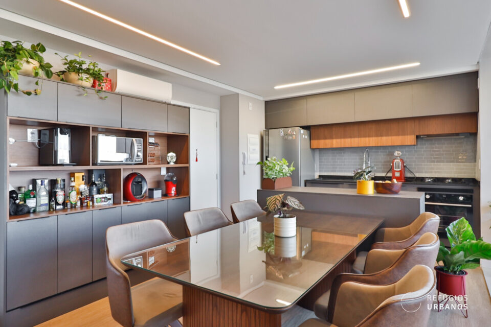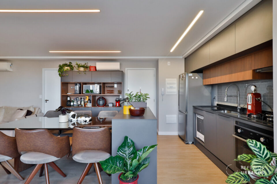 O projeto integrou todos os ambientes sociais (sala, cozinha e varanda), garantindo amplitude, ideal para receber visitas confortavelmente, luminosa que conta com ilha entre cozinha e sala e um lavabo estiloso.