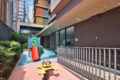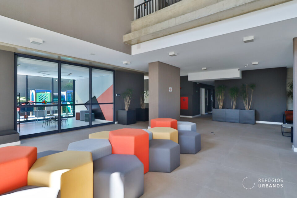 A torre foi concebida como um feixe vertical — com áreas de lazer distribuídas em diferentes andares, cada uma com sua própria vista da cidade. Salão de festas, jogos, brinquedoteca e playground no térreo, lounge no 7º andar, academia no 9º e piscina no 16º. A ideia é descobrir o edifício aos poucos, pavimento a pavimento.