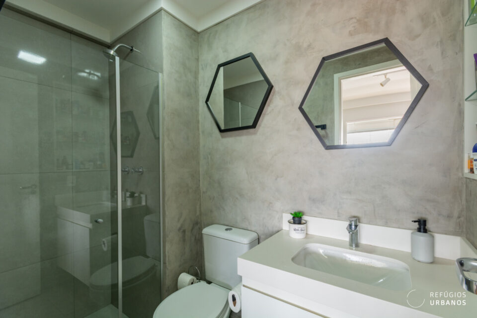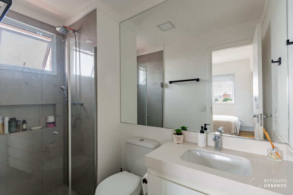 Tratando-se de um apartamento enxuto, a área íntima se resume à suíte, de bom tamanho, e com banheiro na medida certa.