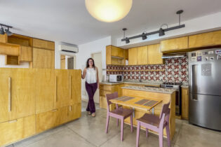 Assim que entramos no apê já notamos a abertura fruto da reforma, criando um balcãozinho que permite a entrada de luz (originalmente era um lobby fechado).
