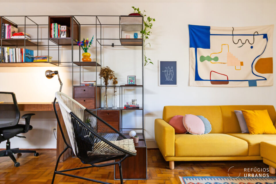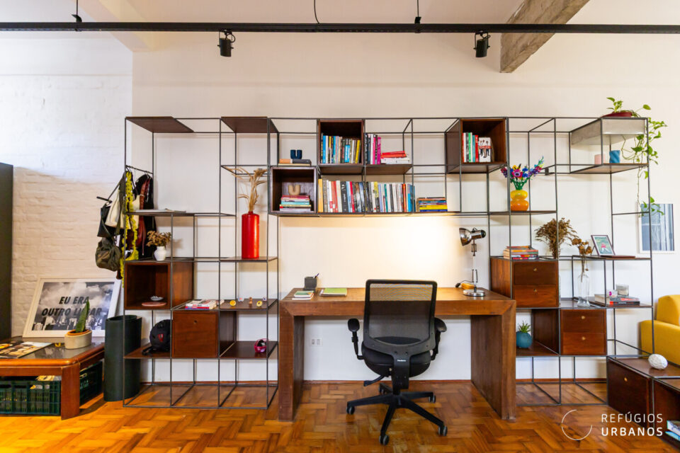 Como bônus, permanecem no imóvel: ar condicionado, uma estante sob medida, um armário planejado no quarto e um rack, o que facilita a mudança e preserva a estética do conjunto.