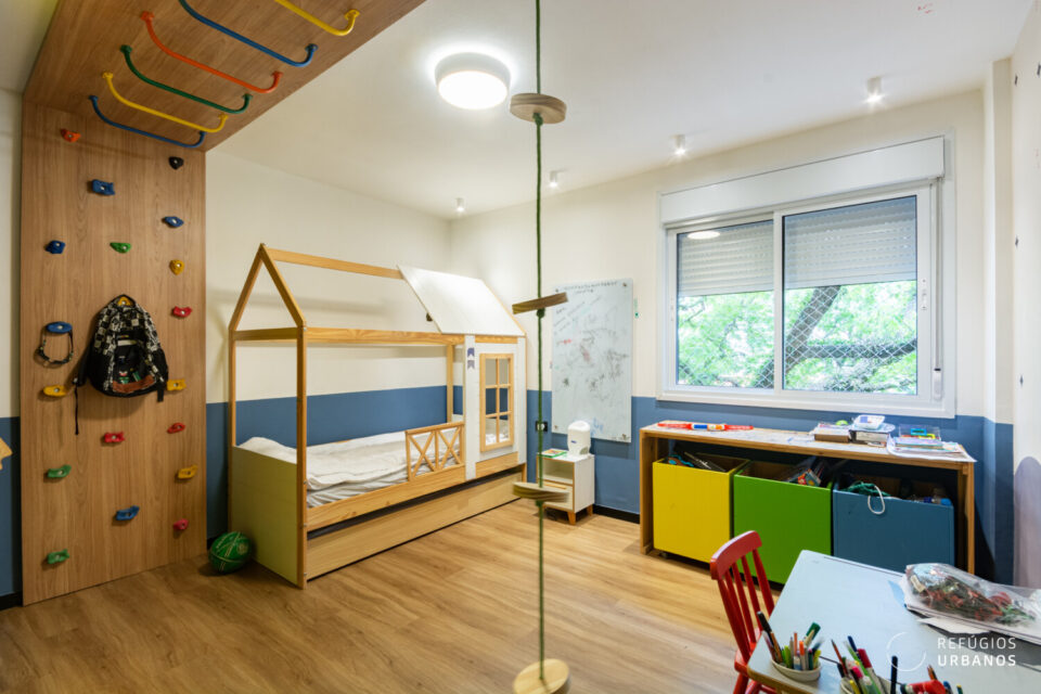 Além disso, o pé-direito é alto e a vista da sala e quartos deliciosas para a copa das árvores.
