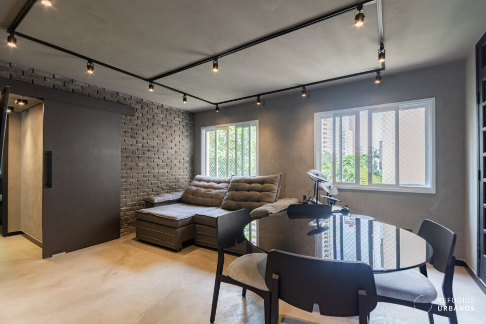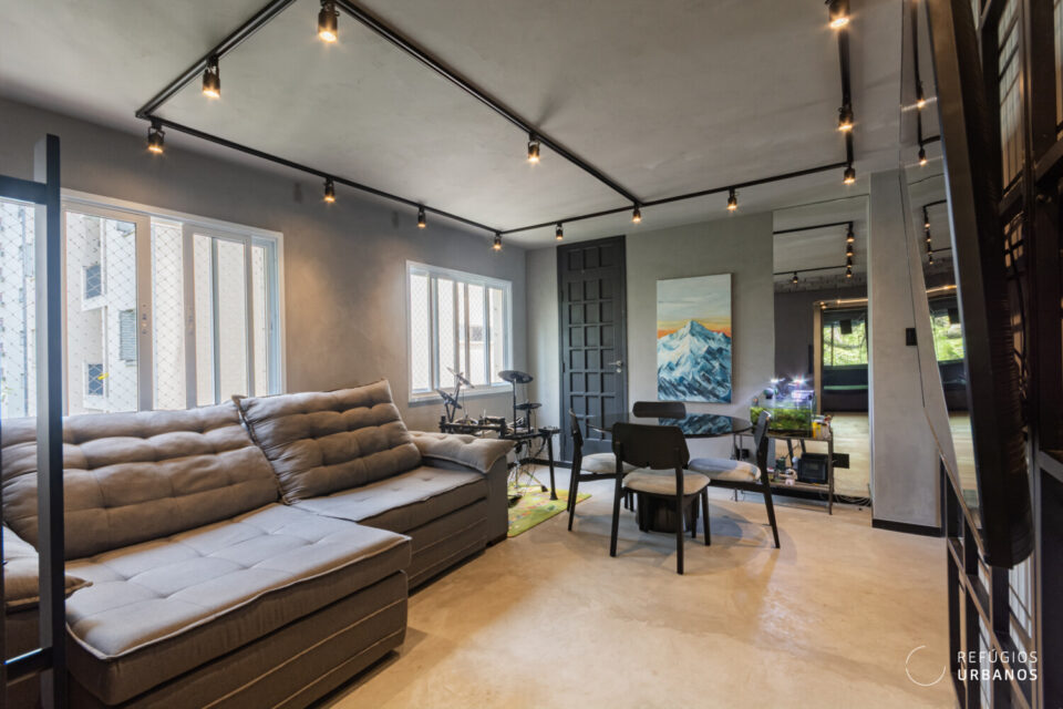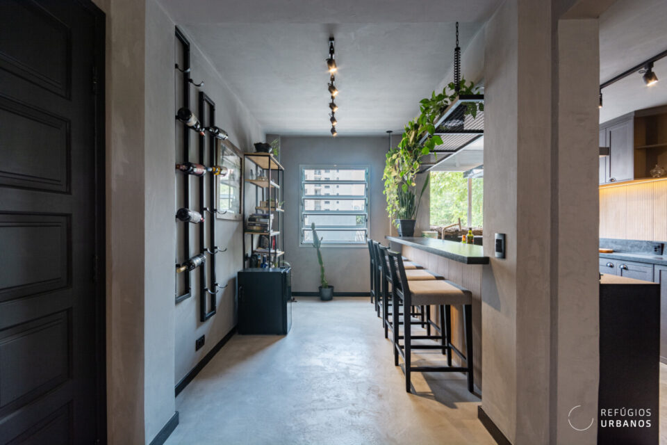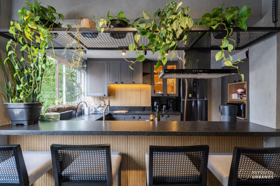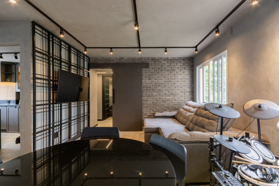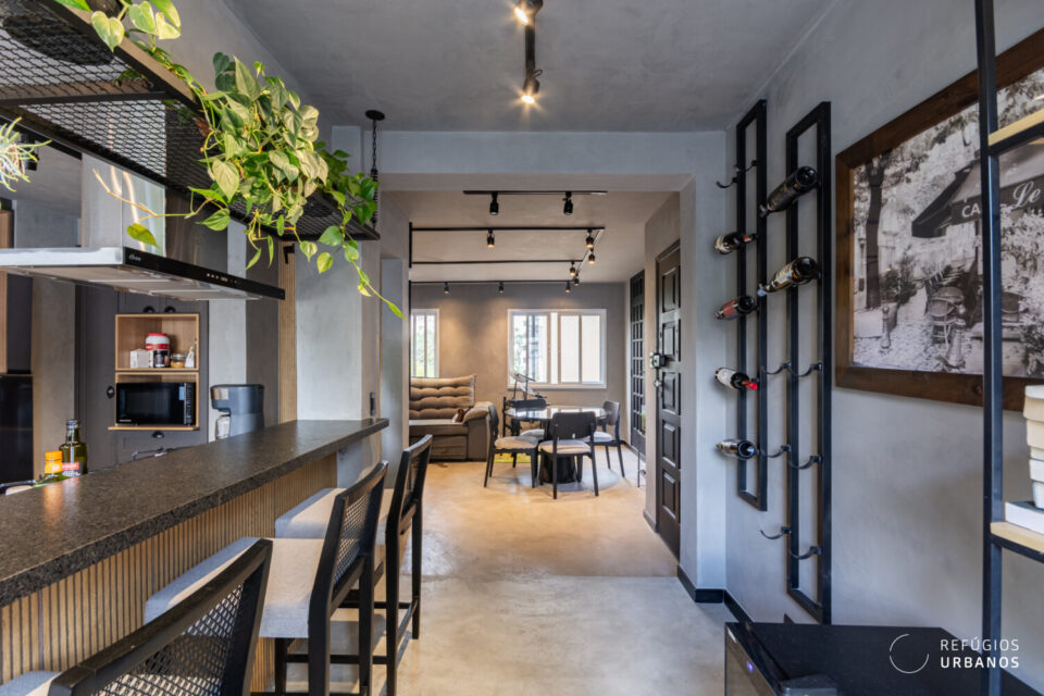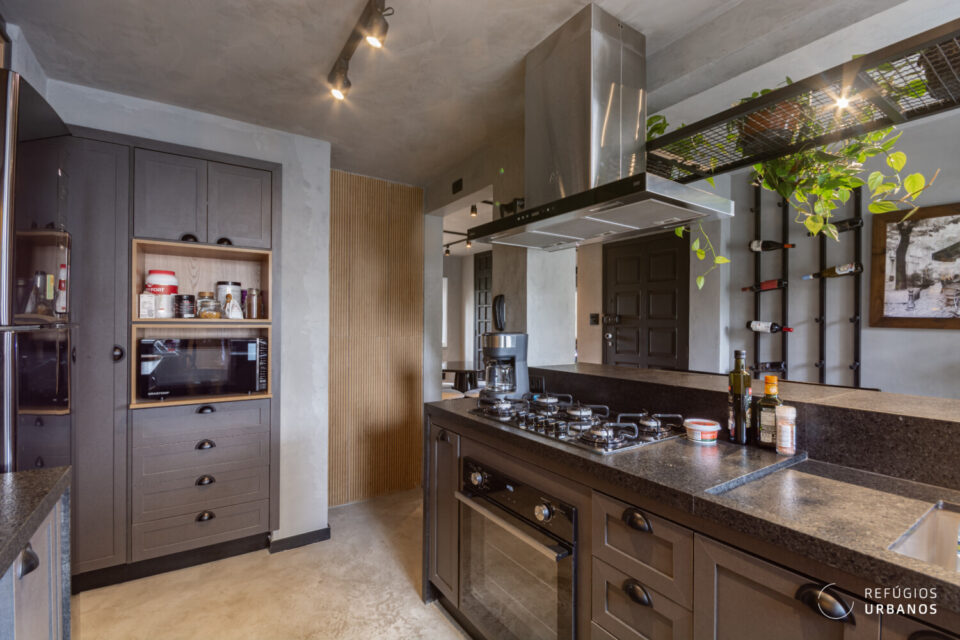 A sala e cozinha foram integradas, mas, ao mesmo tempo, mantêm a privacidade. Cooktop, forno e coifa ficam. A área de serviço foi integrada a cozinha pra deixartudo bem prático.