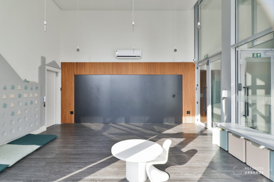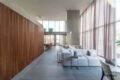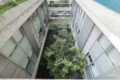 Entre os dois volumes, se abre um amplo pátio ajardinado, que ilumina os espaços internos e cria o gradiente de privacidade e com isso regulando a convivência entre os diversos usos do conjunto.
