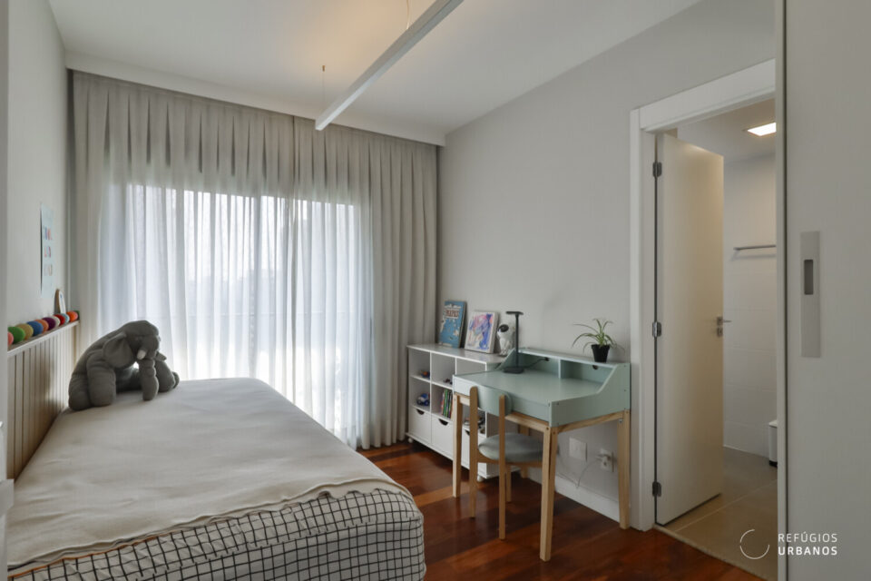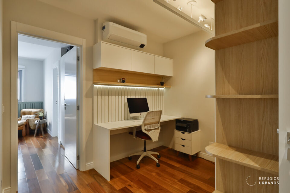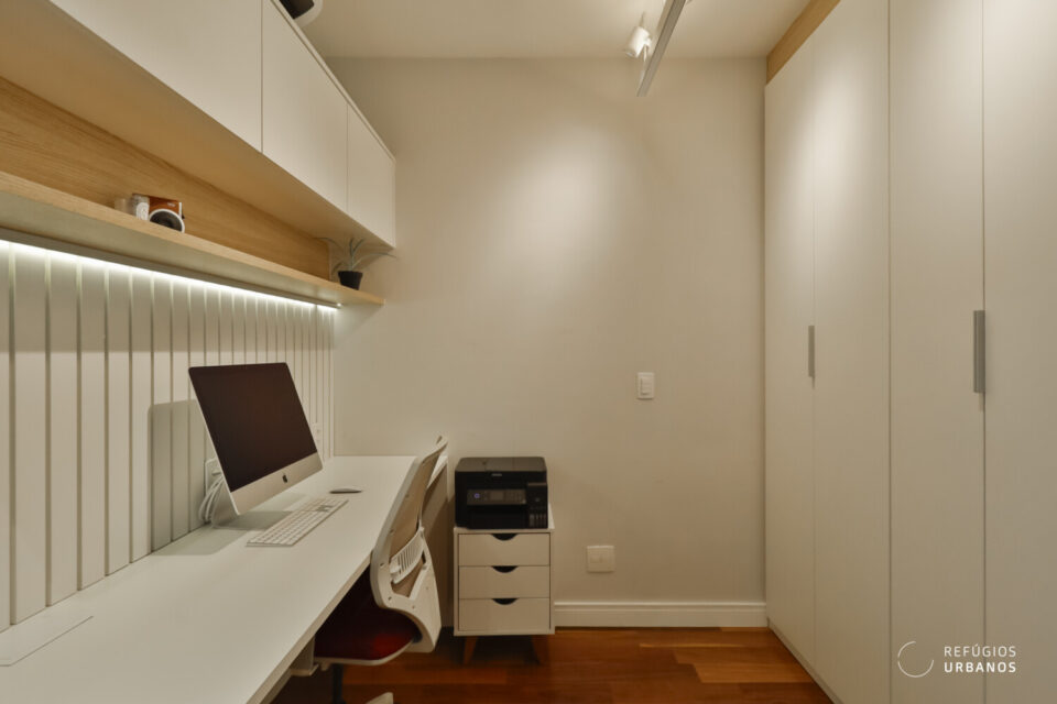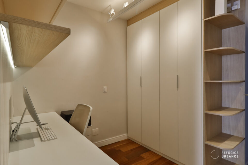 Indo para a área intima do apartamento, temos uma sala que hoje abriga um escritório, com bancada e armários. Porém, pode ser usado também como sala intima de tv para a família.