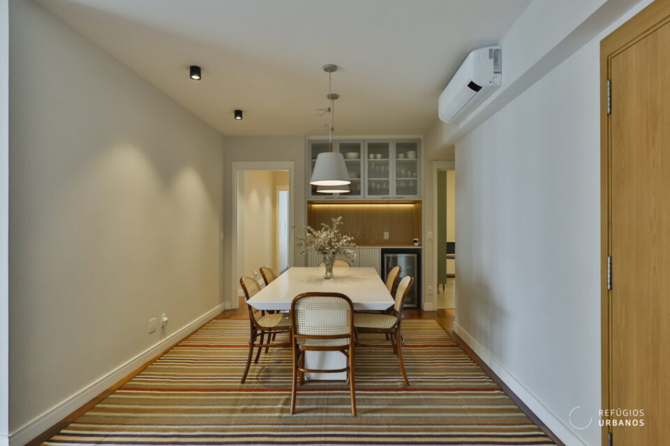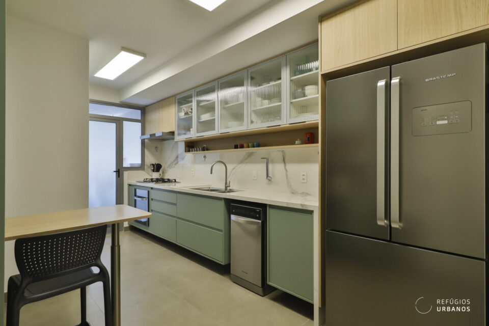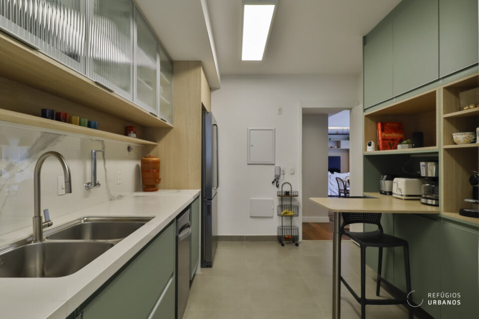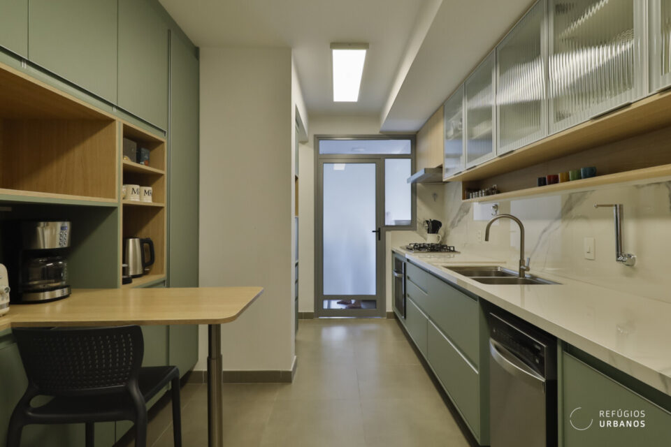 A cozinha, muito bem decorada com uma marcenaria impecável, é bem ventilada e ainda com espaço para mesa de apoio/almoço. Conta ainda com uma ampla despensa e bastante espaço.