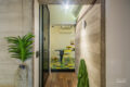 Os volumes, suspensos por pilotis, possuem quatro apartamentos por andar, posicionados ao redor de um hall central com elevadores e escadas.