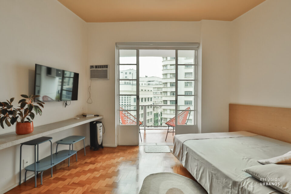 O quarto integrado é um oásis de tranquilidade, com uma cama confortável e uma vista deslumbrante da cidade.