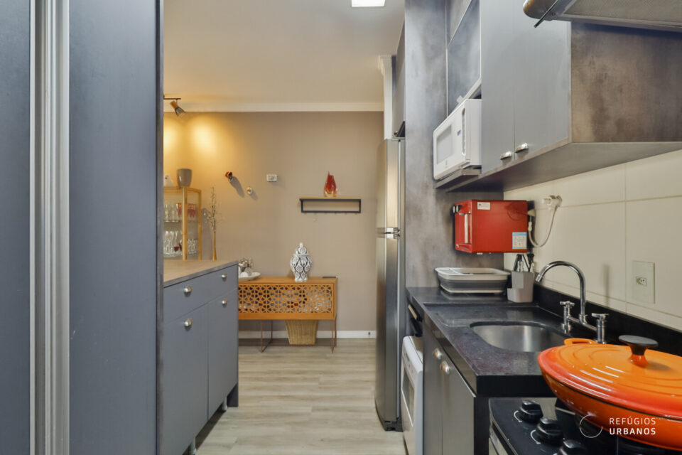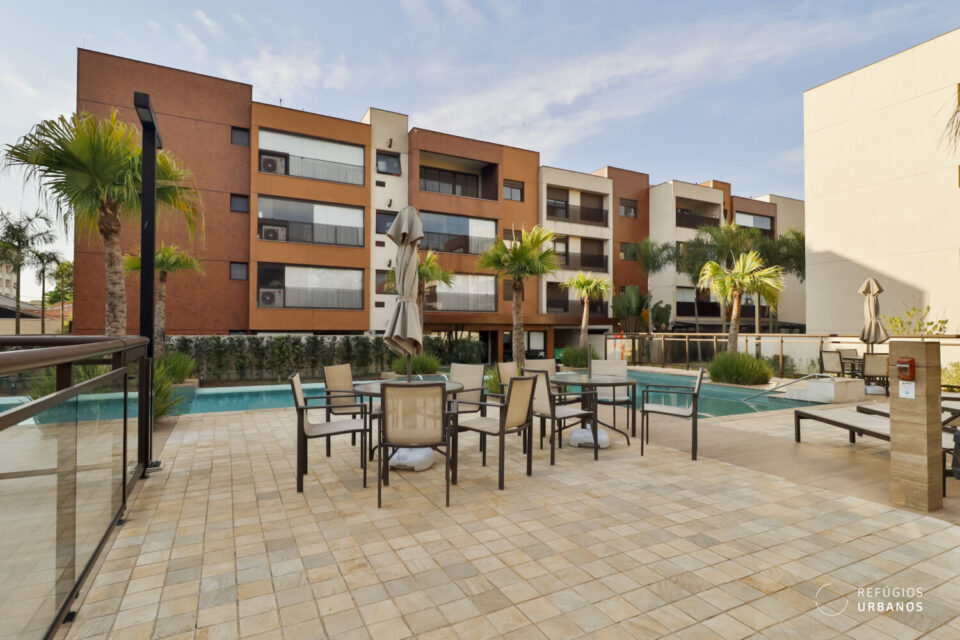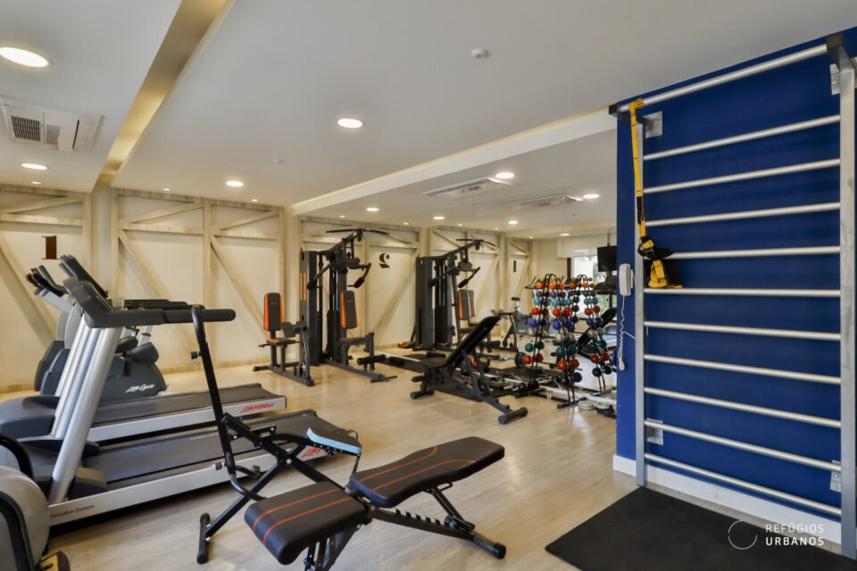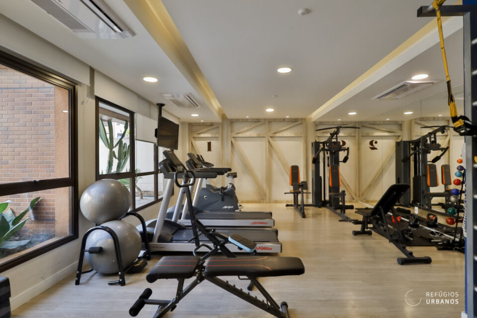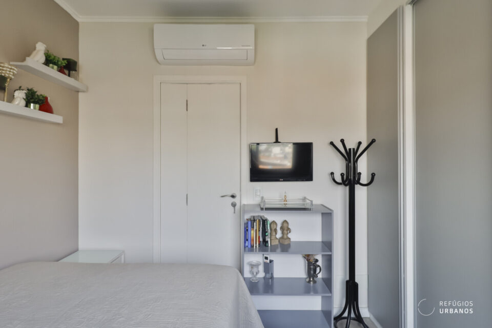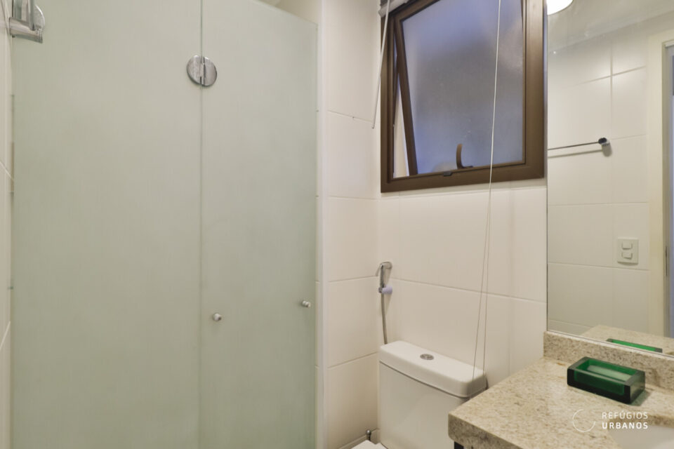 Seguindo para área íntima, encontramos dois quartos; ambos equipados com ar-condicionado. A suíte, se destaca pela janela chão-teto e marcenaria de qualidade. O segundo quarto é igualmente confortável. Um banheiro completo localizado no corredor, serve o quarto e living. Vale destacar que ambos os banheiros possuem ventilação natural e aquecimento a gás.