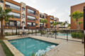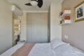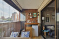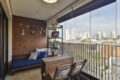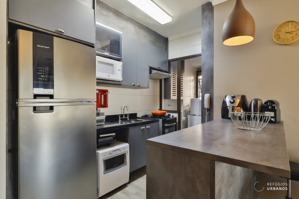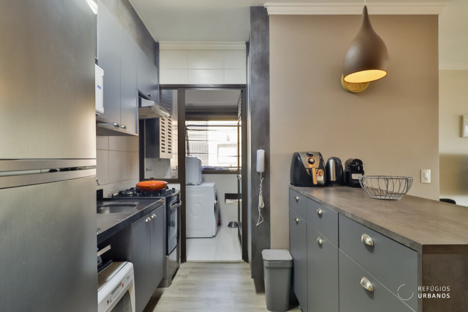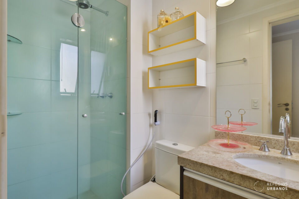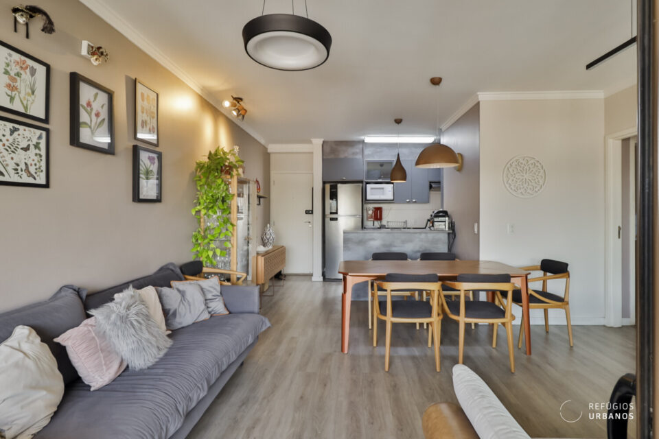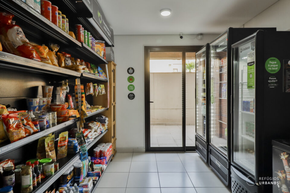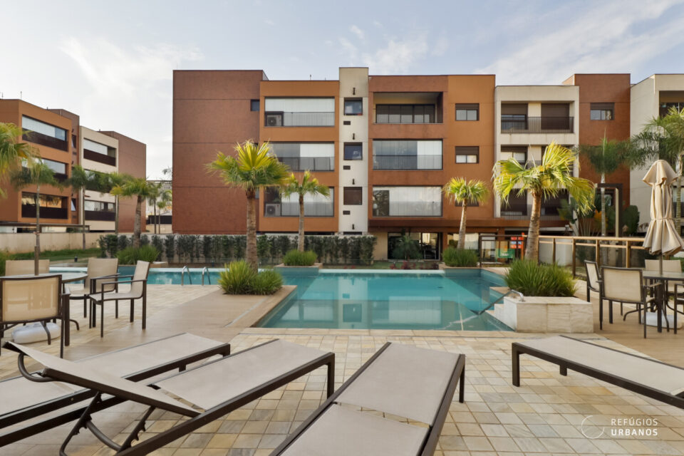 Seguindo para área íntima, encontramos dois quartos; ambos equipados com ar-condicionado. A suíte, se destaca pela janela chão-teto e marcenaria de qualidade. O segundo quarto é igualmente confortável. Um banheiro completo localizado no corredor, serve o quarto e living. Vale destacar que ambos os banheiros possuem ventilação natural e aquecimento a gás.