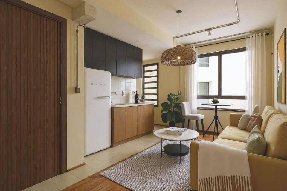 Esta unidade tem 40m², um quarto, um banheiro, e embora seja compacta, ela possui detalhes que fazem muita diferença: janelas grandes e ventilação cruzada.